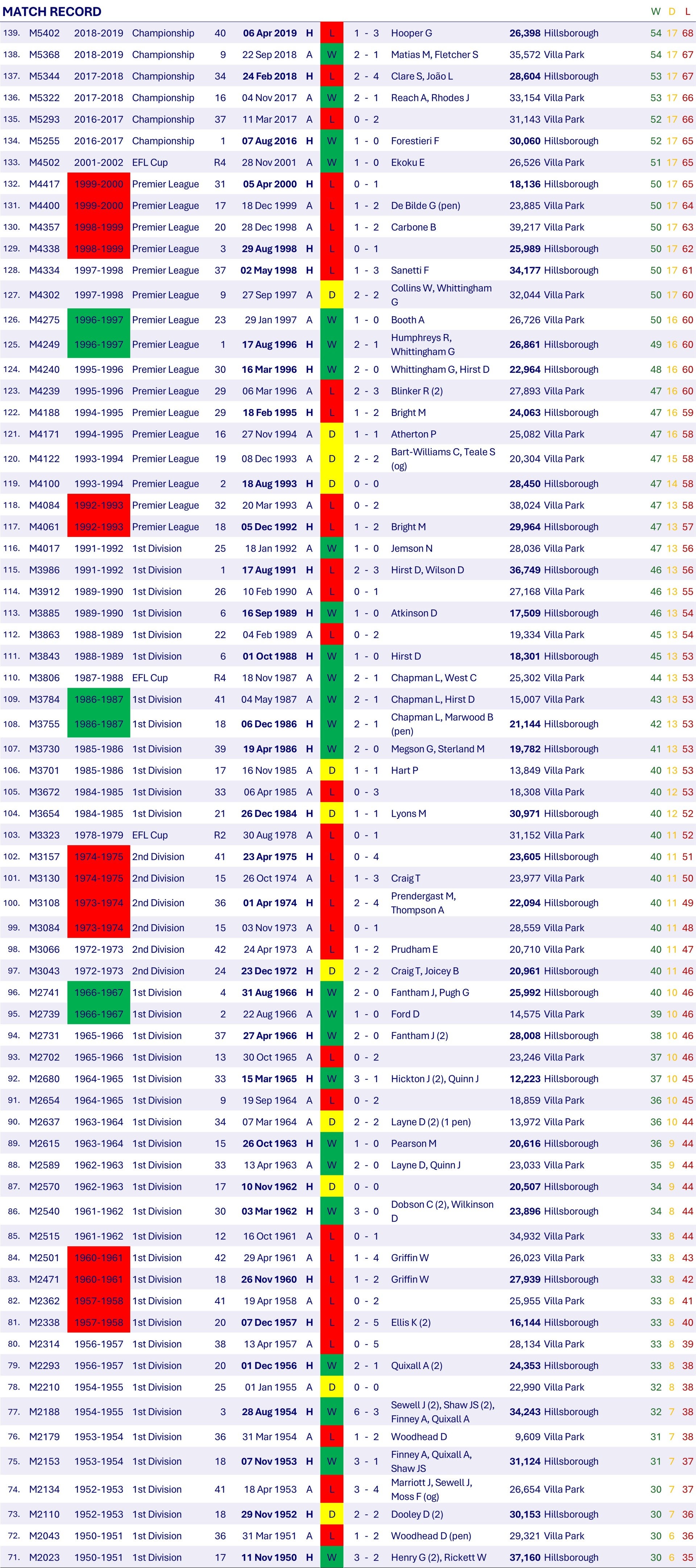 Match M0259 (14.) is notable for having been abandoned after 79.5 minutes due to bad light, with Wednesday winning 3-1 at the time. The referee Mr Scragg misses his train and the match starts seven minutes late with a local offical acting as referee. After a further delay at half-time Mr Scragg takes the whistle for the second half only to abandon the match 34.5 minutes in. Aston Villa naturally want the entire match replayed but the Football League's management committee did not deem it necessary and the remaining 10.5 minutes were subsequently played on the 13th March 1999. Wednesday scored another goal to run out 4-1 winners and in all 29 players took part in this remarkable fixture! Wednesday players who played in both parts of the match were credited with one appearance, and Wednesday players who only played in one part of the game were also credited with one appearance, so in all 16 Wednesday players were credited with an appearance in the match!