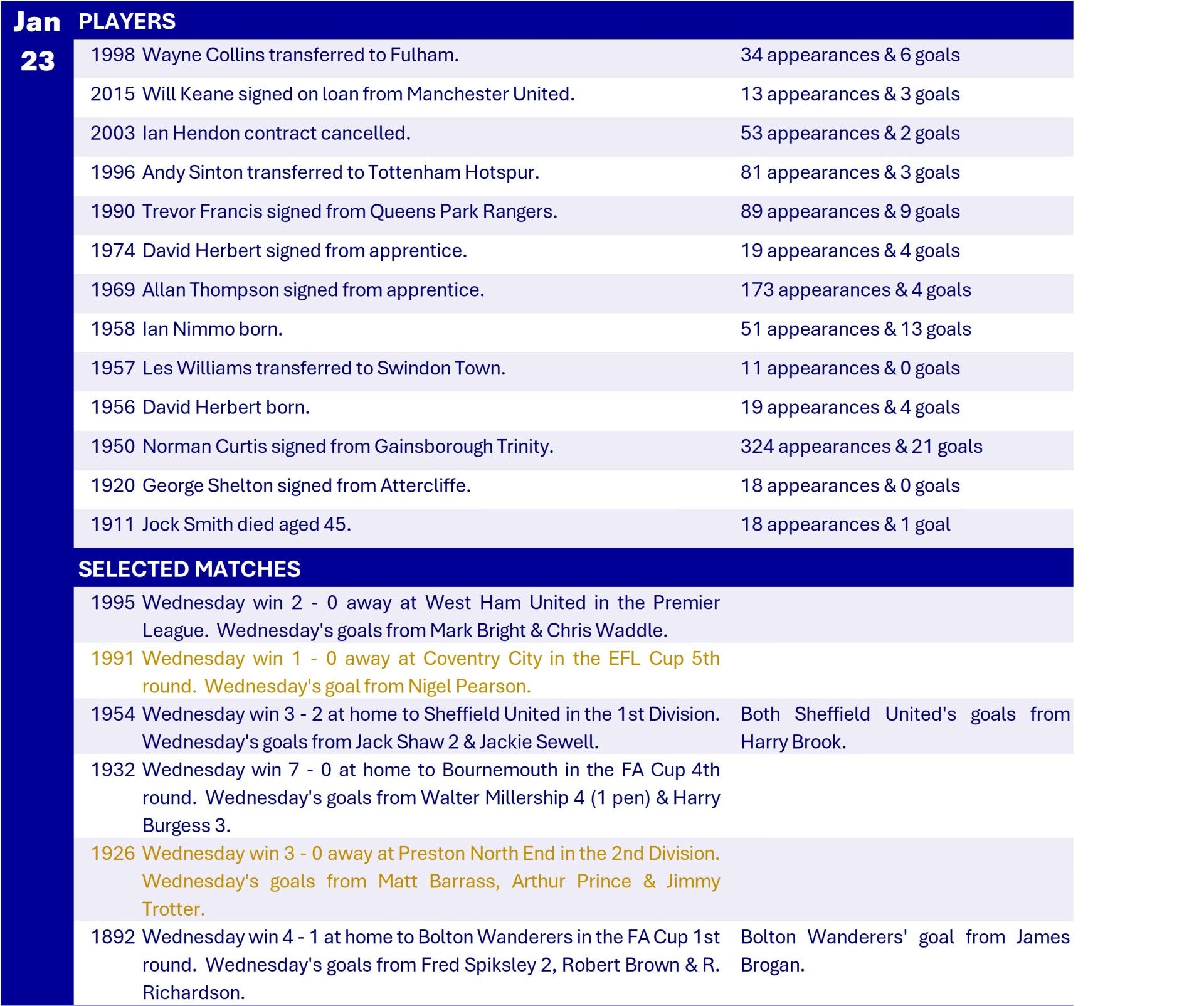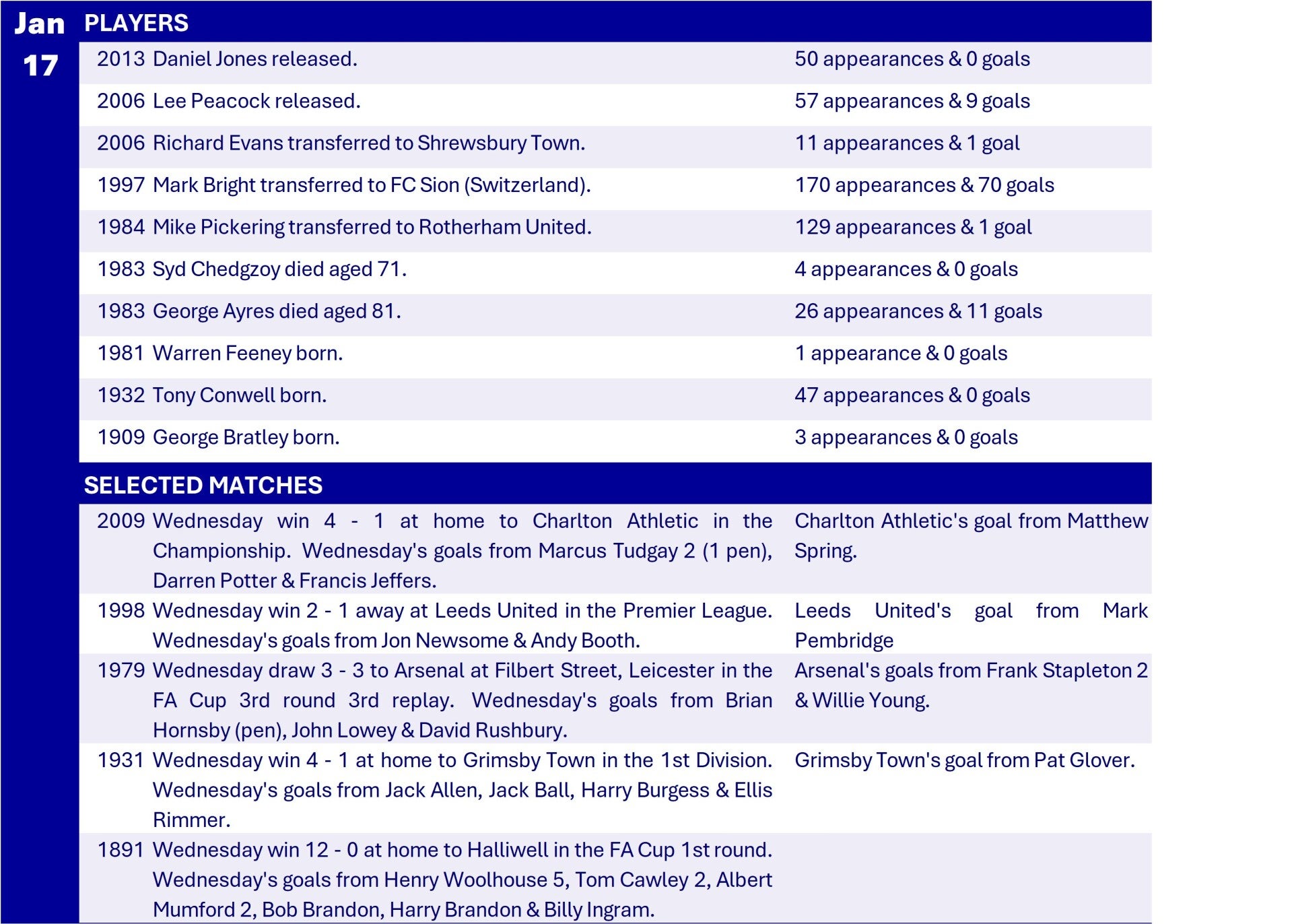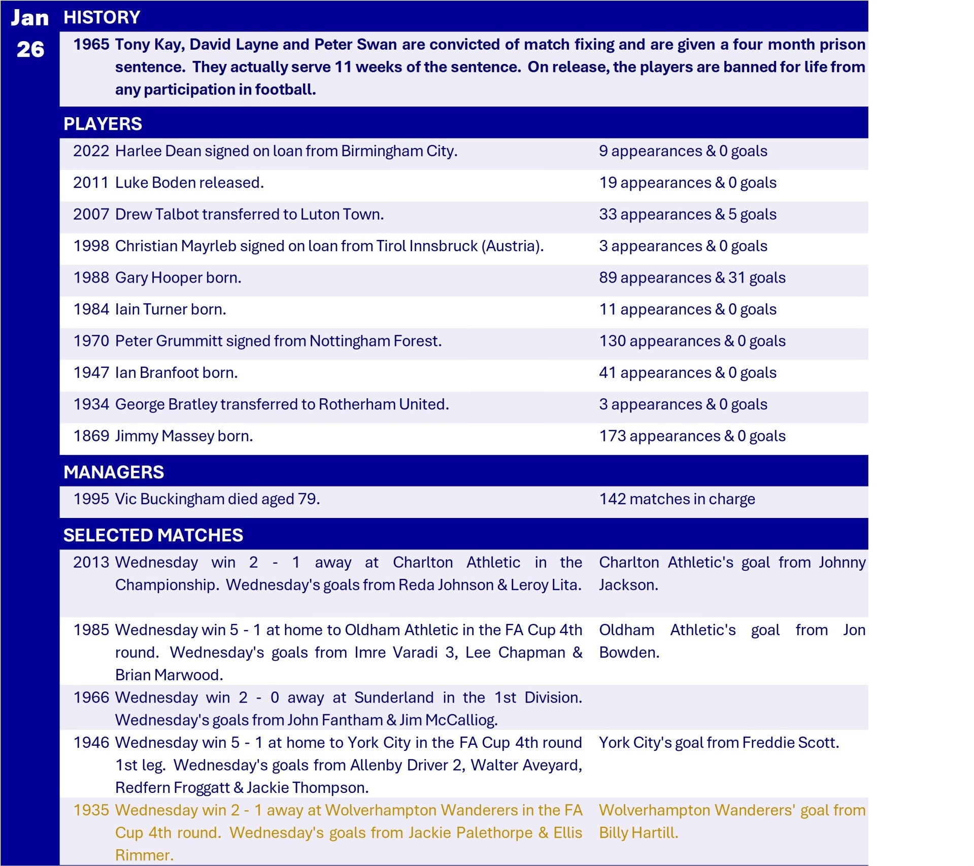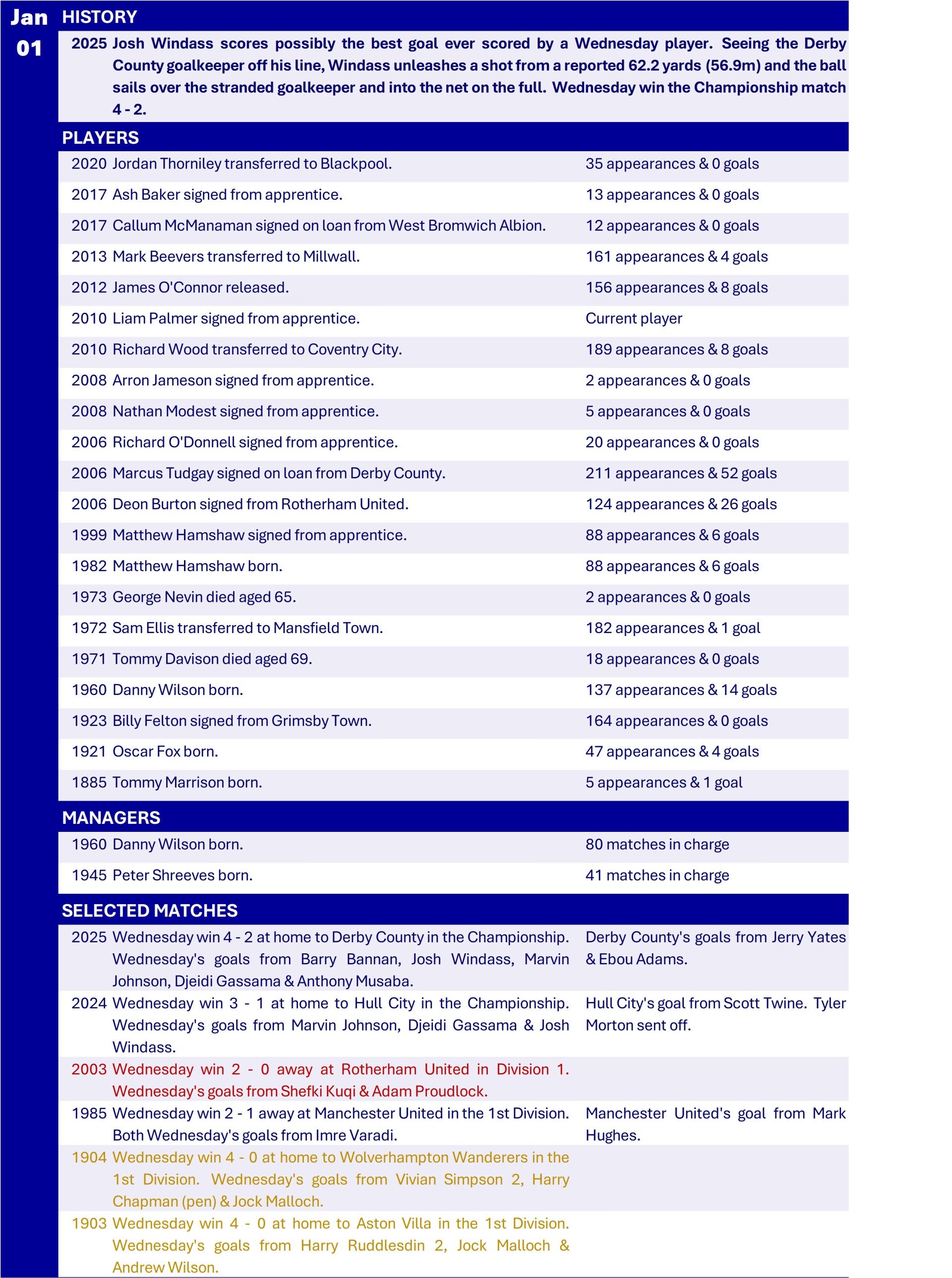 All Wednesday Matches, Players and Managers