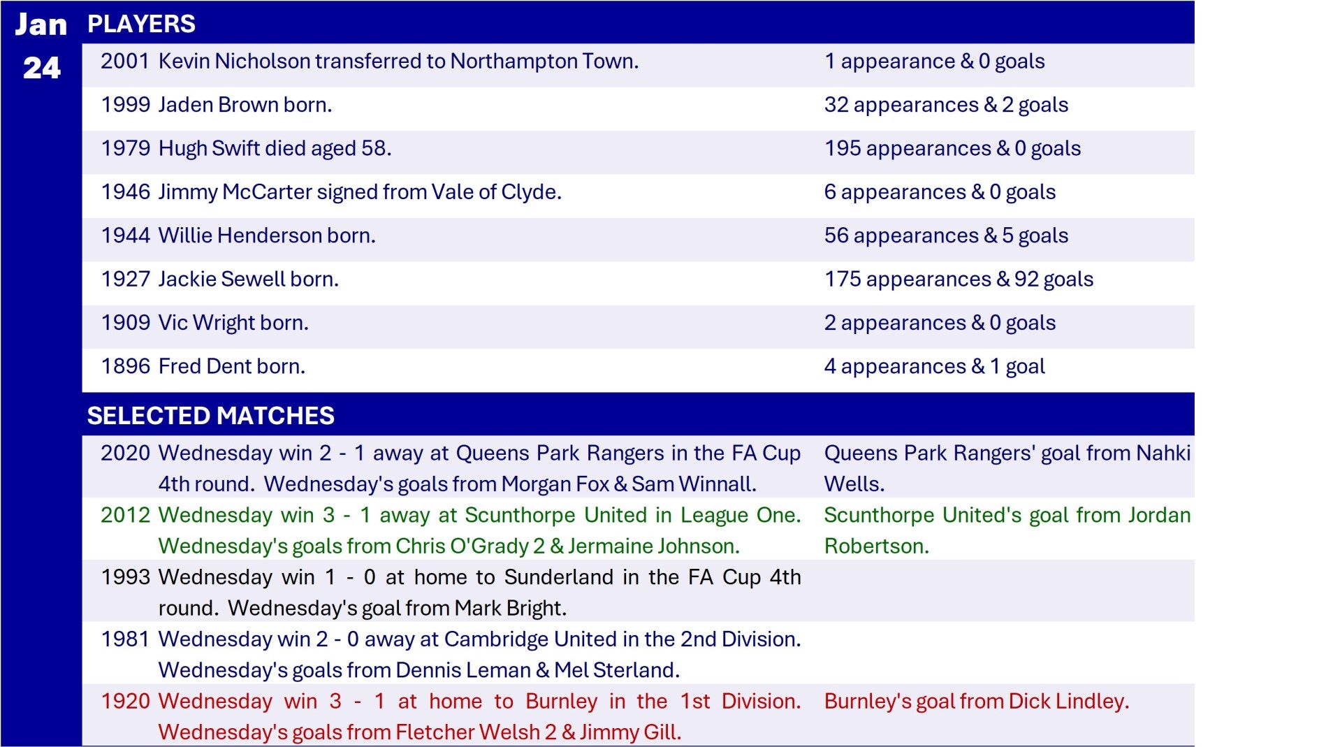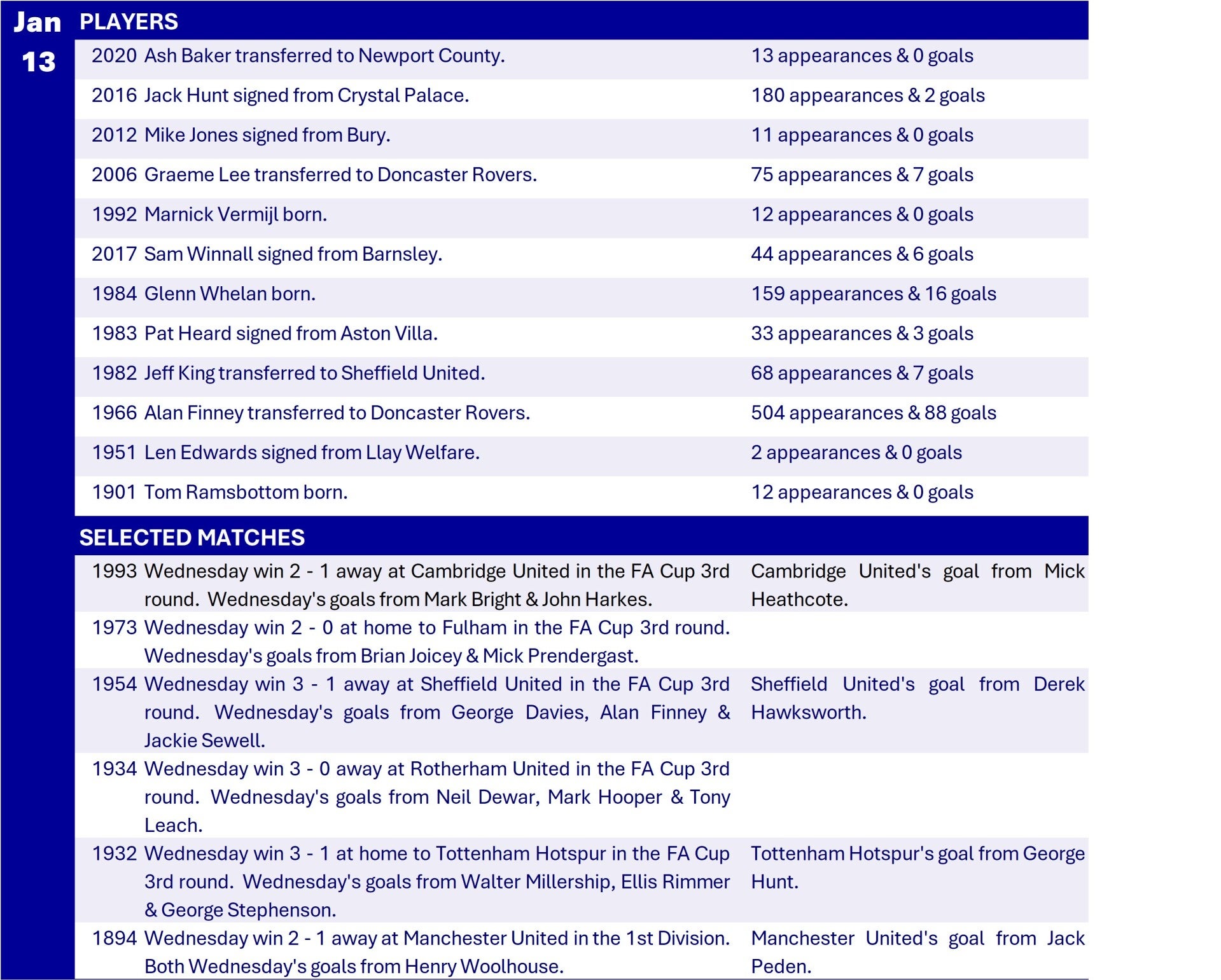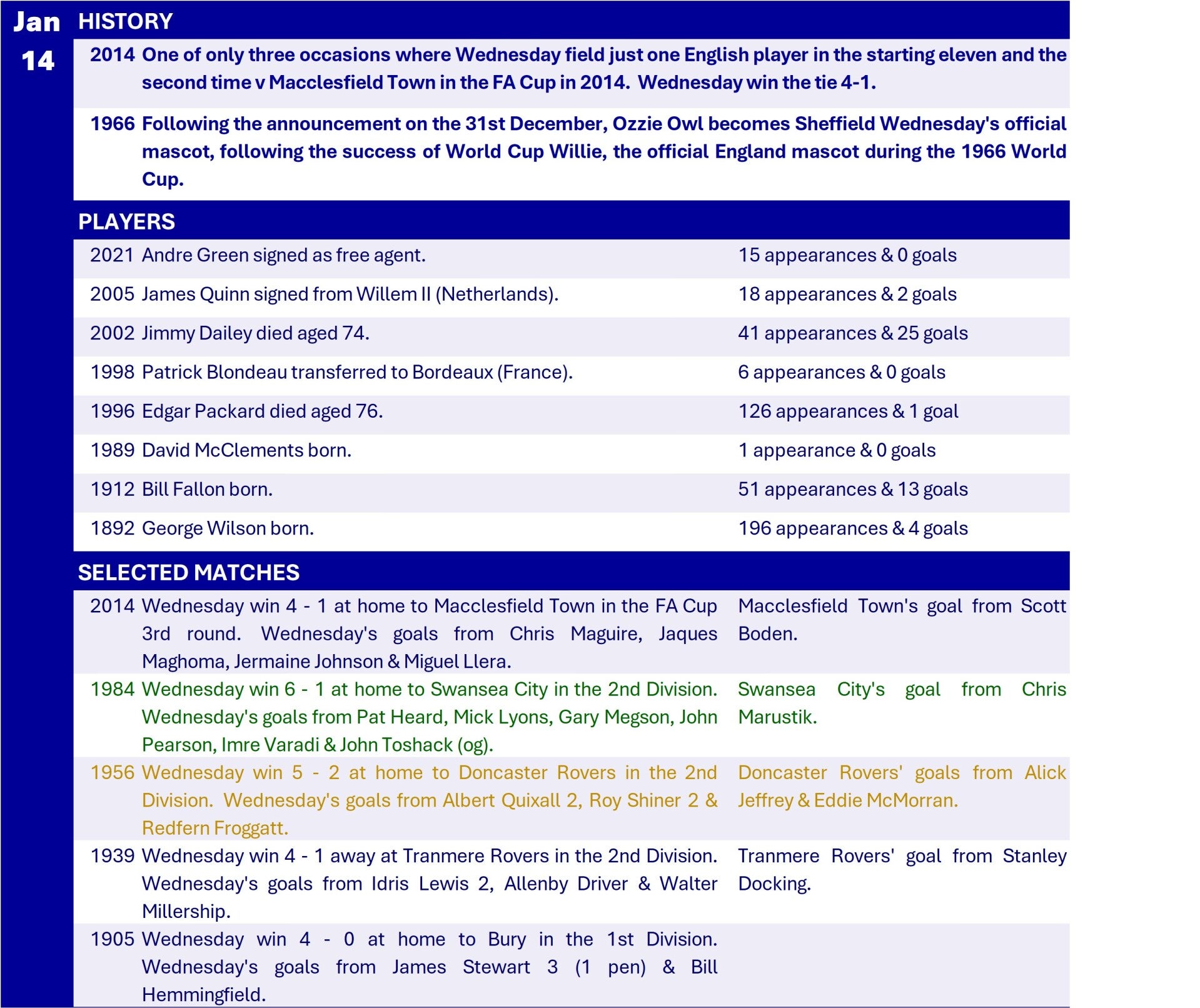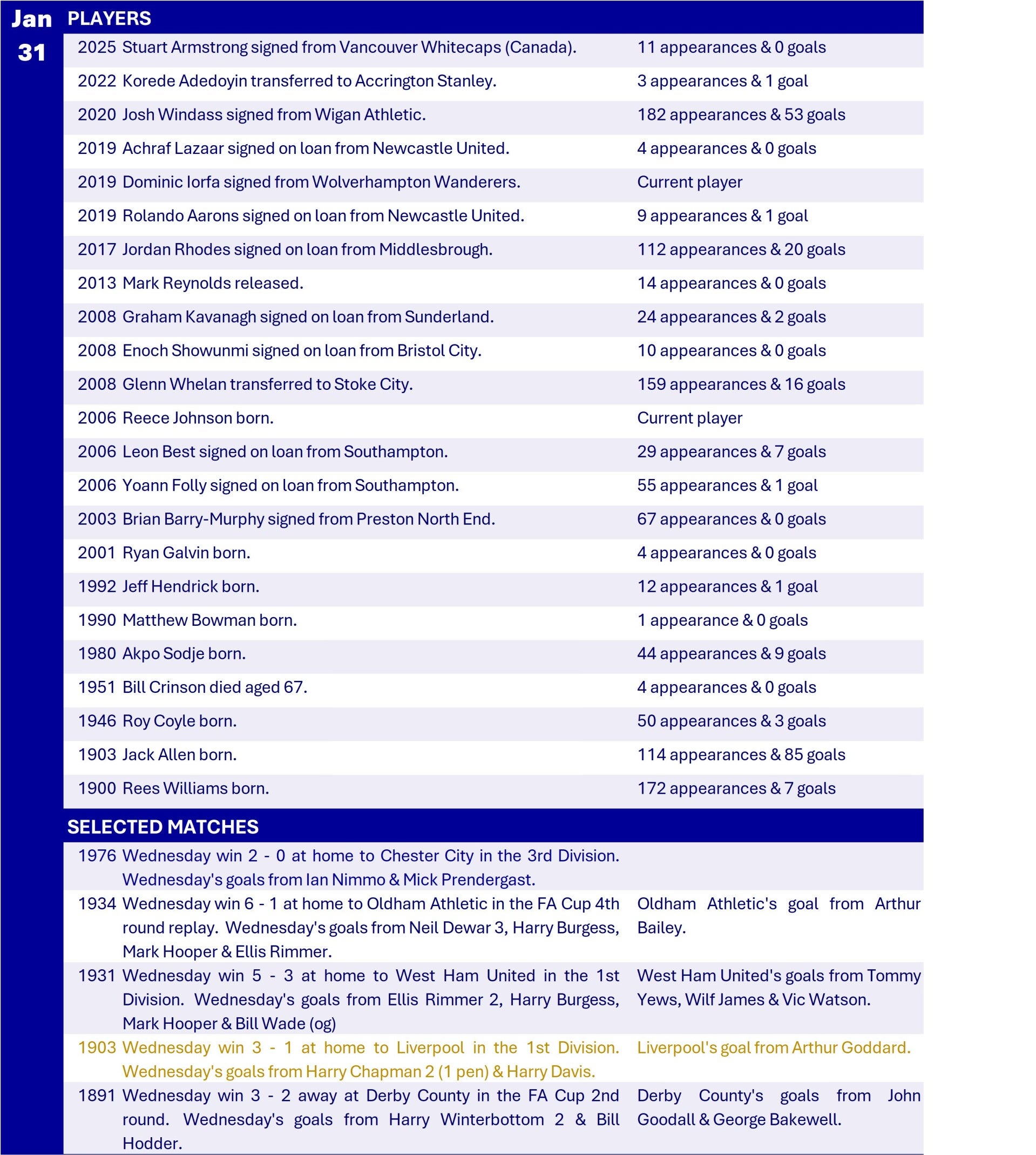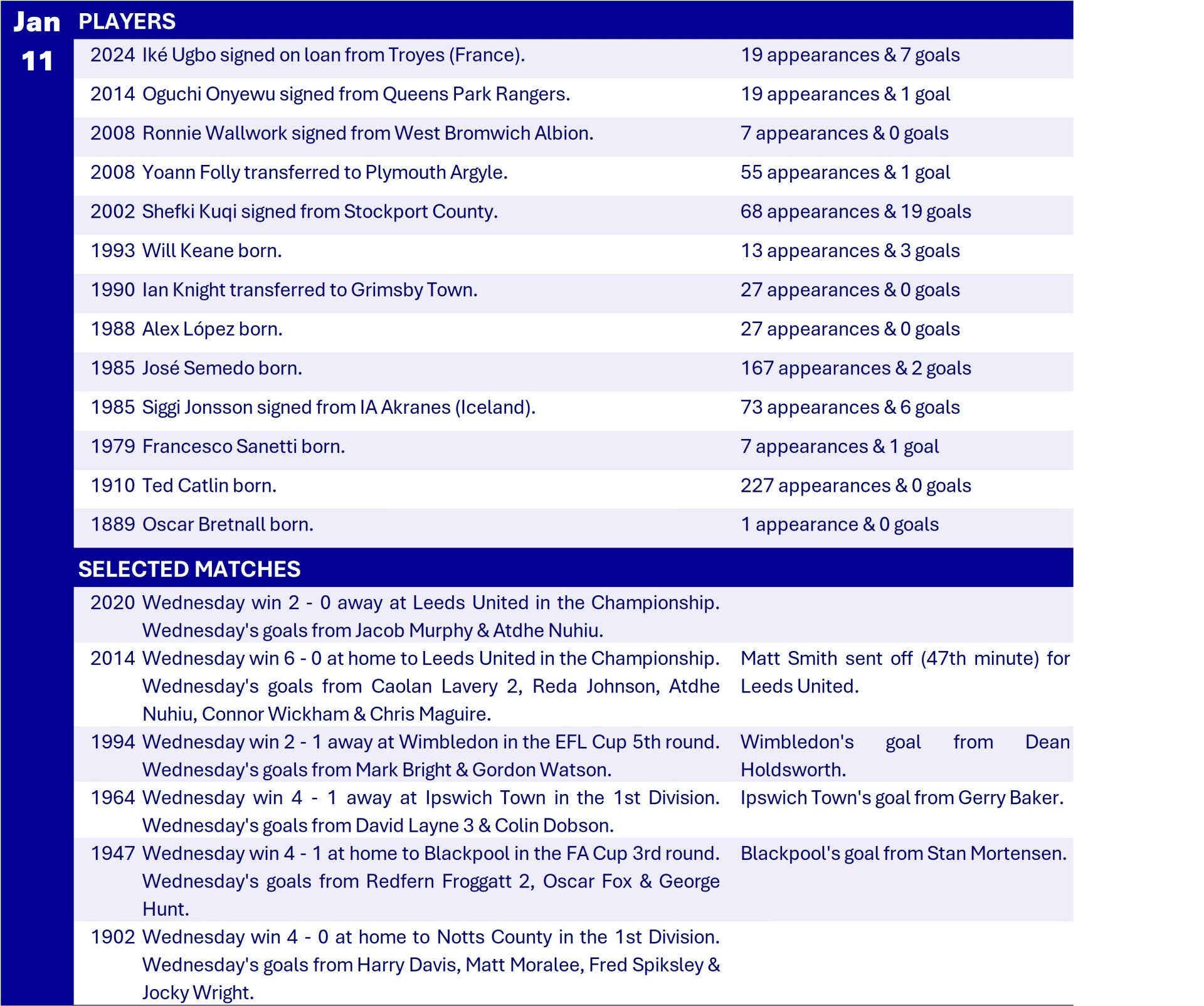 All Wednesday Matches, Players and Managers