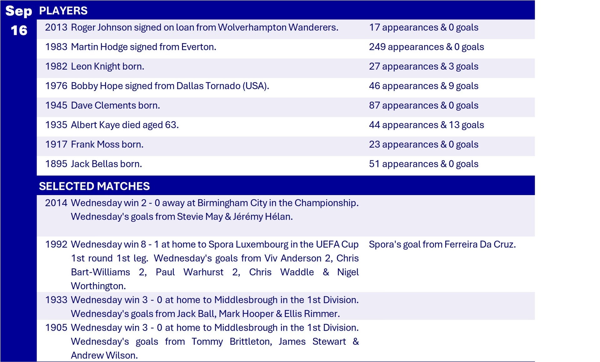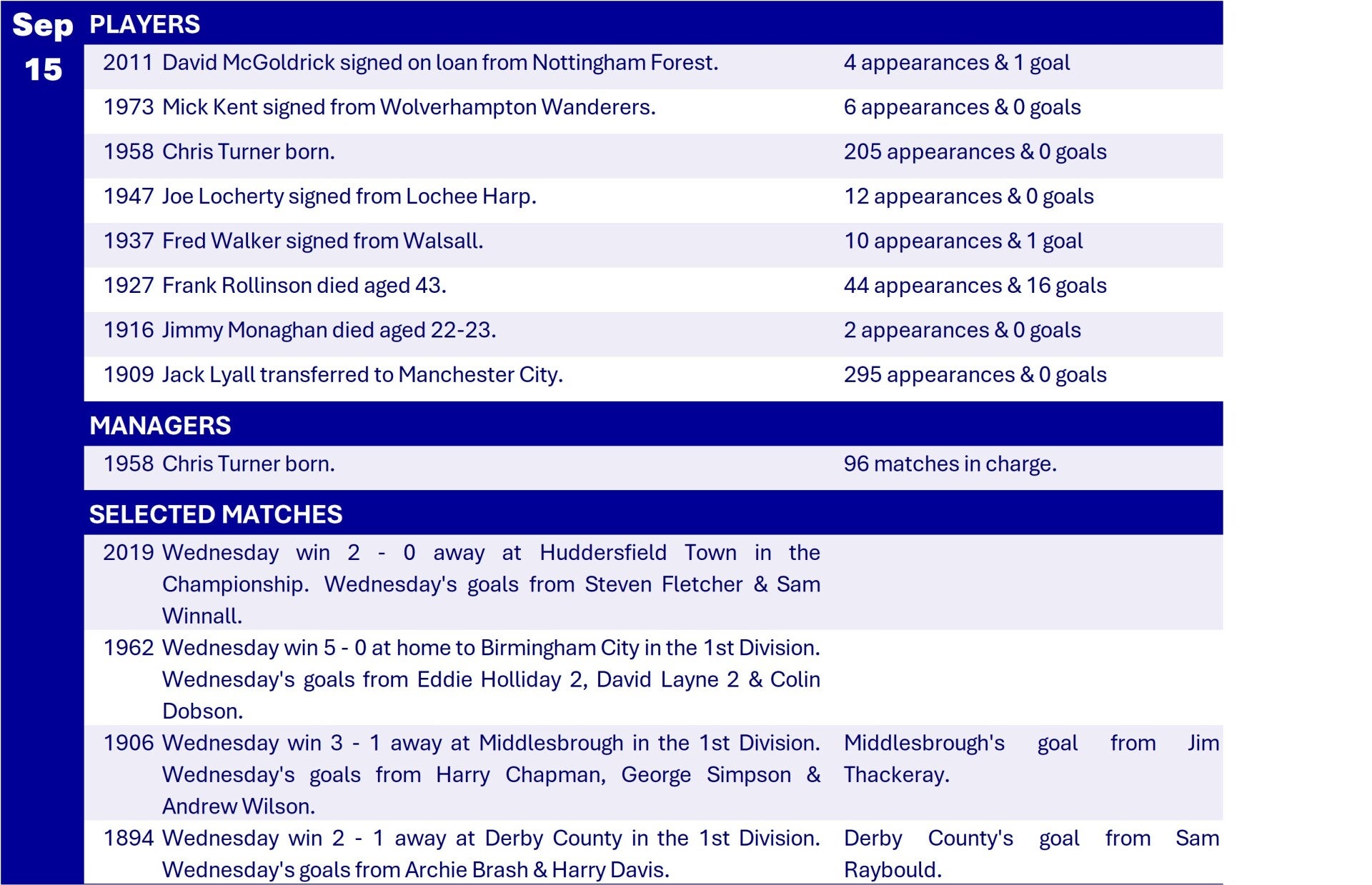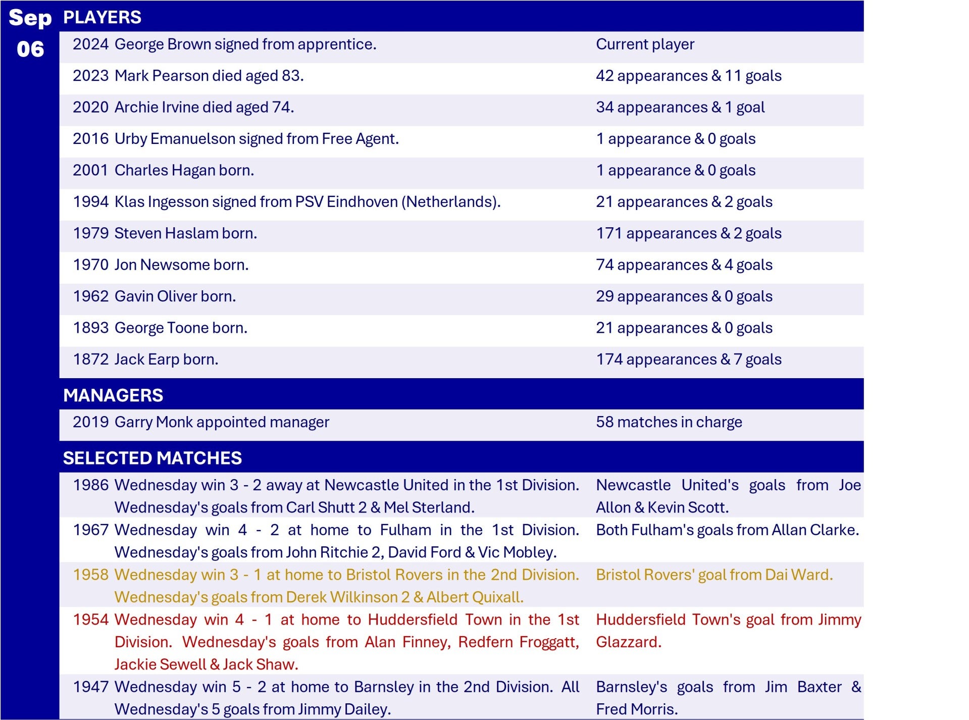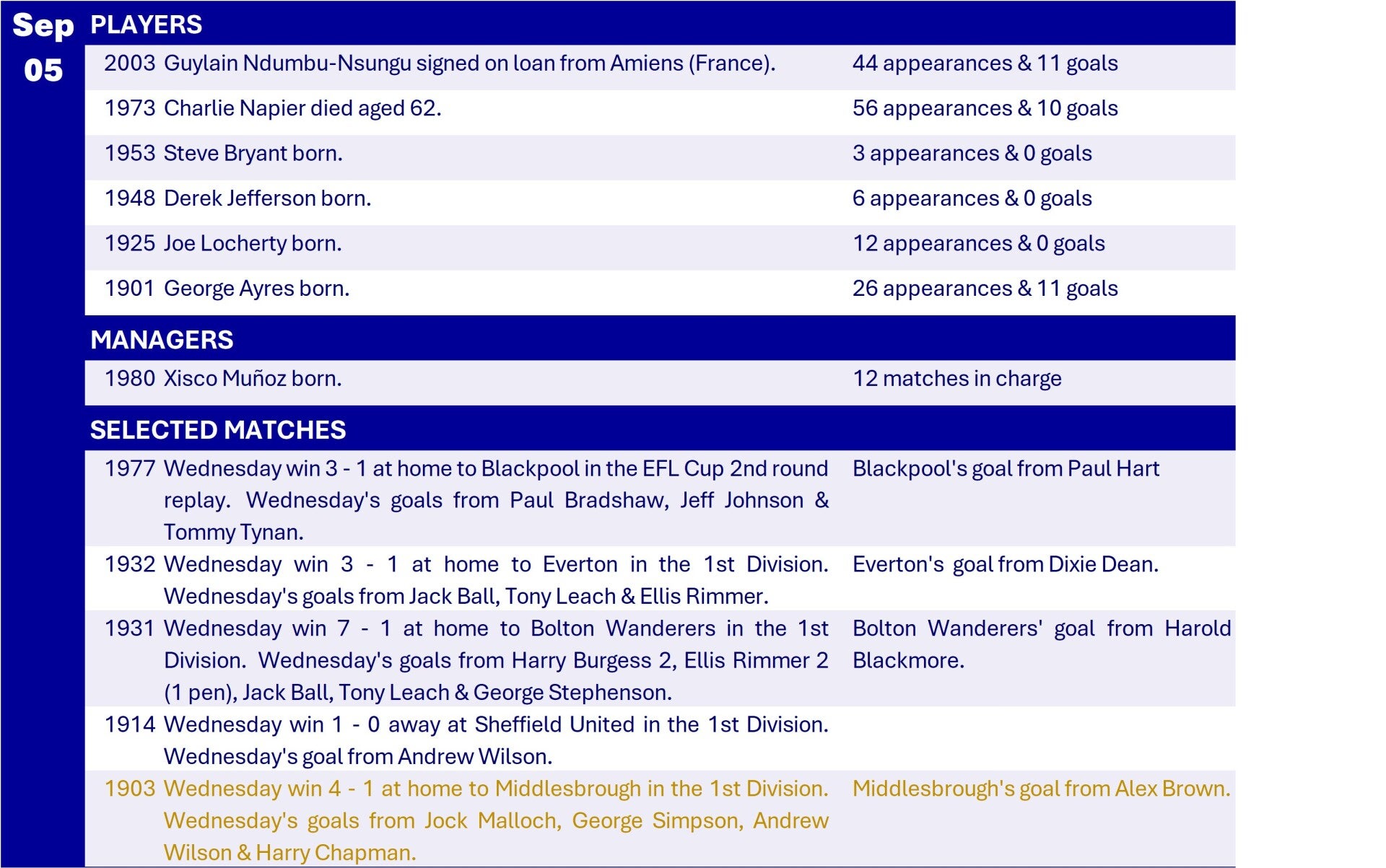 All Wednesday Matches, Players and Managers