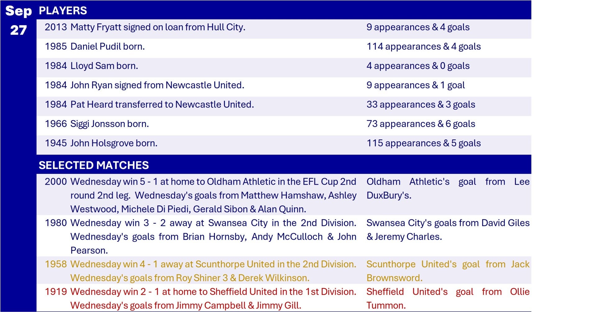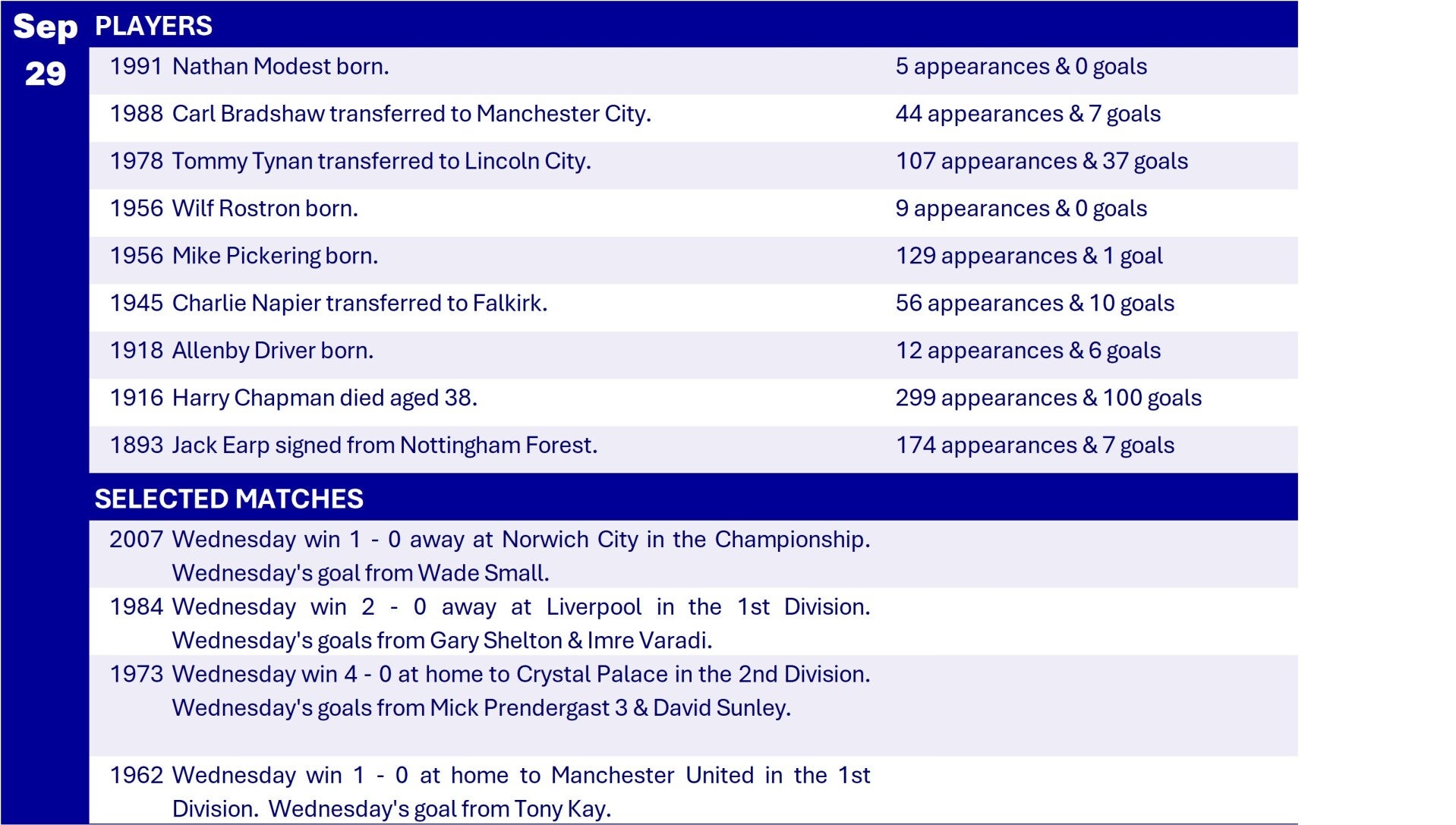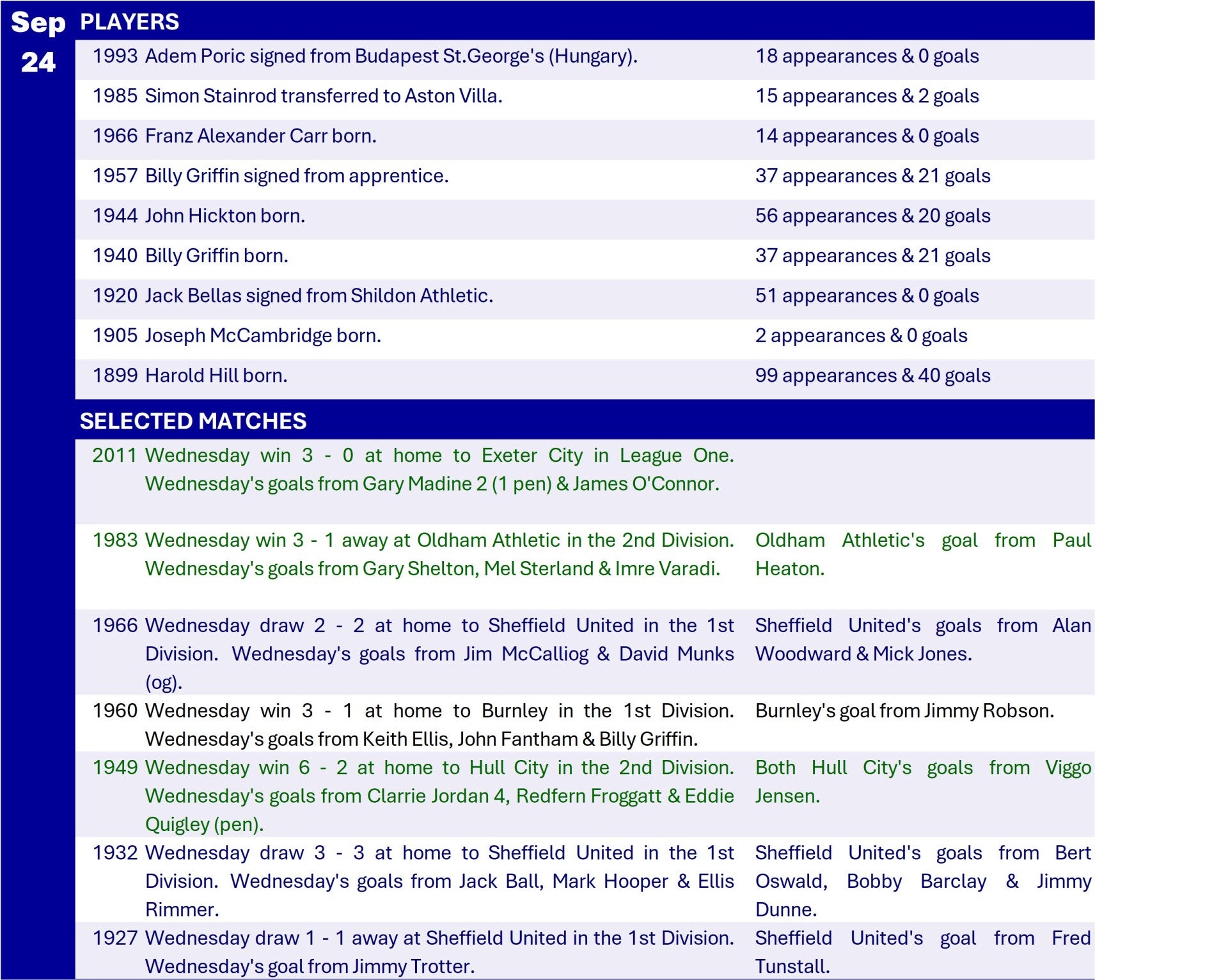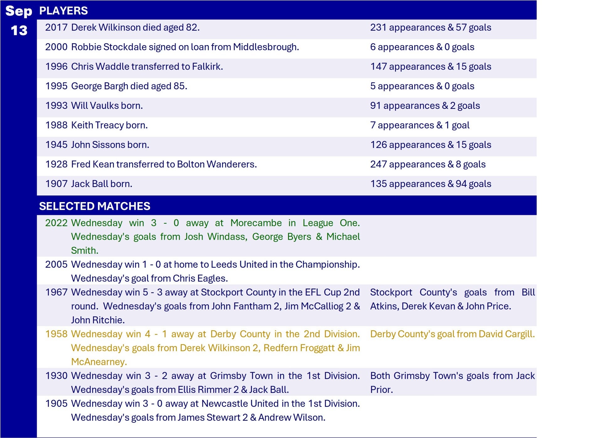 All Wednesday Matches, Players and Managers