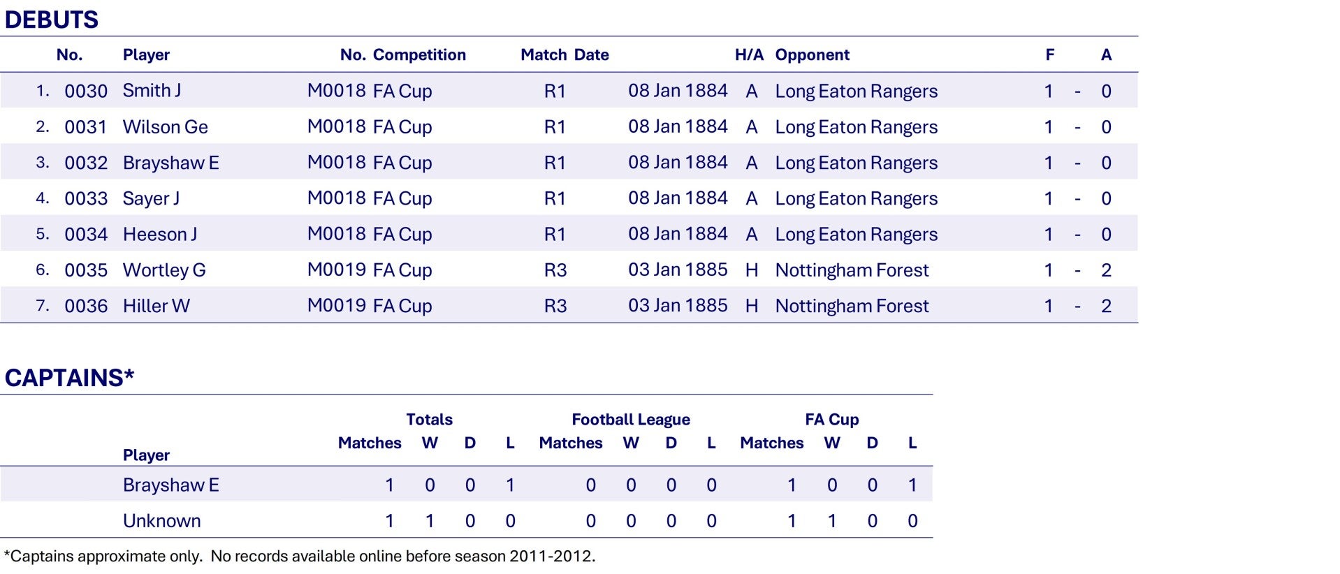 Wednesday beat Long Eaton at the Recreation Ground in the 1st round and get a bye in the 2nd round before losing to Nottingham Forest at Bramall Lane in the 3rd round.