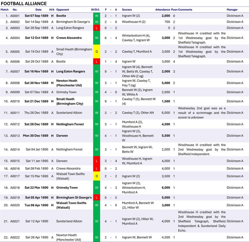 The Football Alliance was founded at a meeting in Manchester on the 9th May 1889. Wednesday and a number of other clubs had been turned down for election to the Football League and at the instigation of Wednesday's President John Holmes, the Football Alliance was founded with 12 clubs as founder members. Mr Holmes was given the position of treasurer (hon.). Wednesday went on to win the Championship in the first ever Football Alliance season.