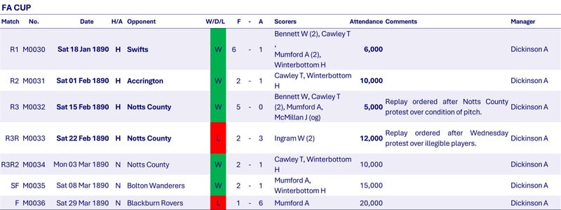 In the FA Cup, Wednesday beat London Swifts at Olive Grove in round one and 1st Division Accrington at Olive Grove in round two. In the 3rd round Wednesday play three matches against Notts County as protests from both teams cause two replays to be played, Wednesday winning through 2-1 at the County Ground, Derby. In the semi-final at Wellington Road, Birmingham, Wednesday met 1st Division Bolton Wanderers, who had already defeated Sheffield United 13-0 and Cup holders Preston in previous rounds. Wednesday triumphed 2-1 to reach the Final, which was played at the Kennington Oval, London. Unfortunately Wednesday are thrashed 6-1 by Blackburn Rovers who's six goals remain the record for the most by one team in an FA Cup final, equalled by Bury in 1903 and by Manchester City in 2019.