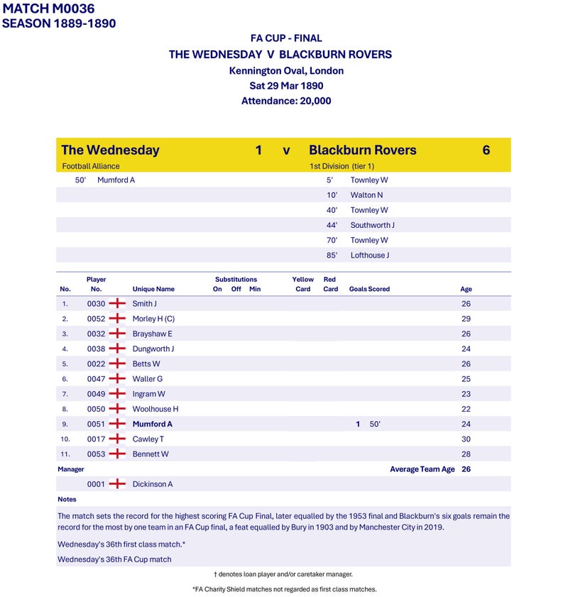 Wednesday play Blackburn Rovers in the Final at the Kennington Oval. They are handicapped by losing captain Henry Winterbottom, who is injured in the previous match and Wednesday, who wear blue shirts and white shorts are led out by amateur Haydn Morley. Billy Ingram is persuaded to play, but is clearly not well and is inefective. Blackburn who field nine internationals in their side are too good for a weakened Wednesday side and are 4-0 up by half-time. Wednesday pull a goal back through Albert Mumford (although some publications credit it to Micky Bennett), but Rovers score two more to run out 6-1 winners. The match sets the record for the highest scoring FA Cup Final, later equalled by the 1953 final and Blackburn's six goals remain the record for the most by one team in an FA Cup final, a feat equalled by Bury in 1903 and by Manchester City in 2019.