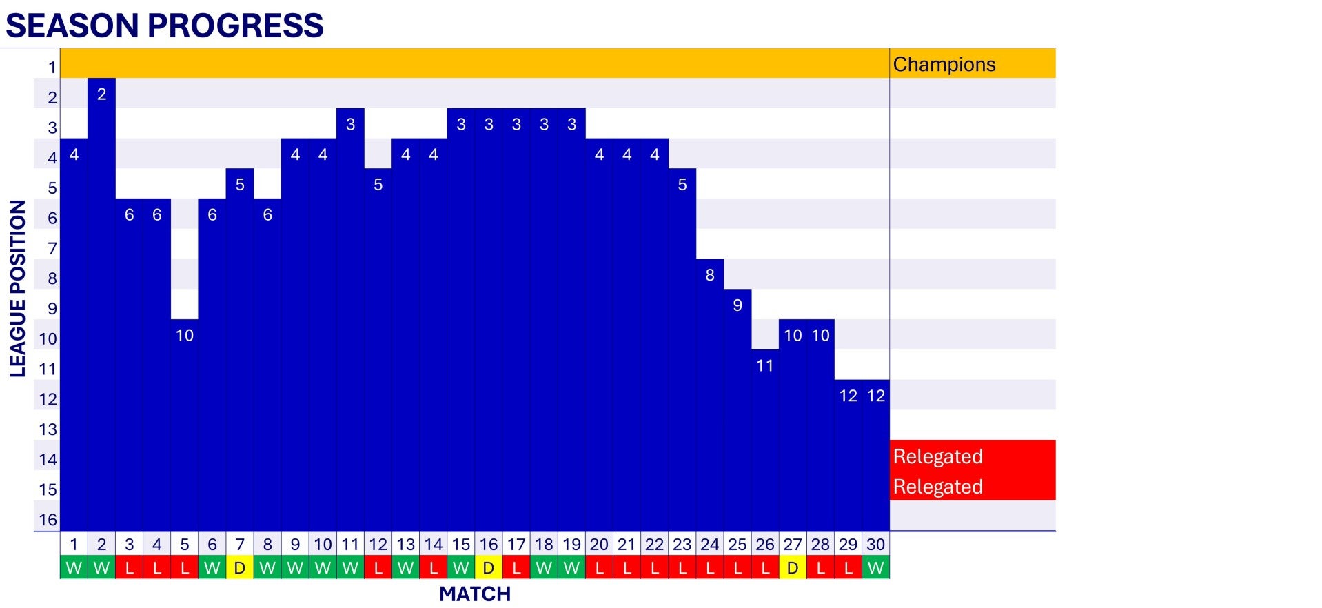 In Wednesday's first season they get off to a good start and are 3rd in early January after thrashing Manchester United 5-1 at North Road and West Brom 6-0 at Olive Grove. Unfortunately Wednesday lose seven straight matches and pick up just one point in ten matches. Thankfully they win the last match of the season against Notts County to avoid having to take part in the dreaded test matches.