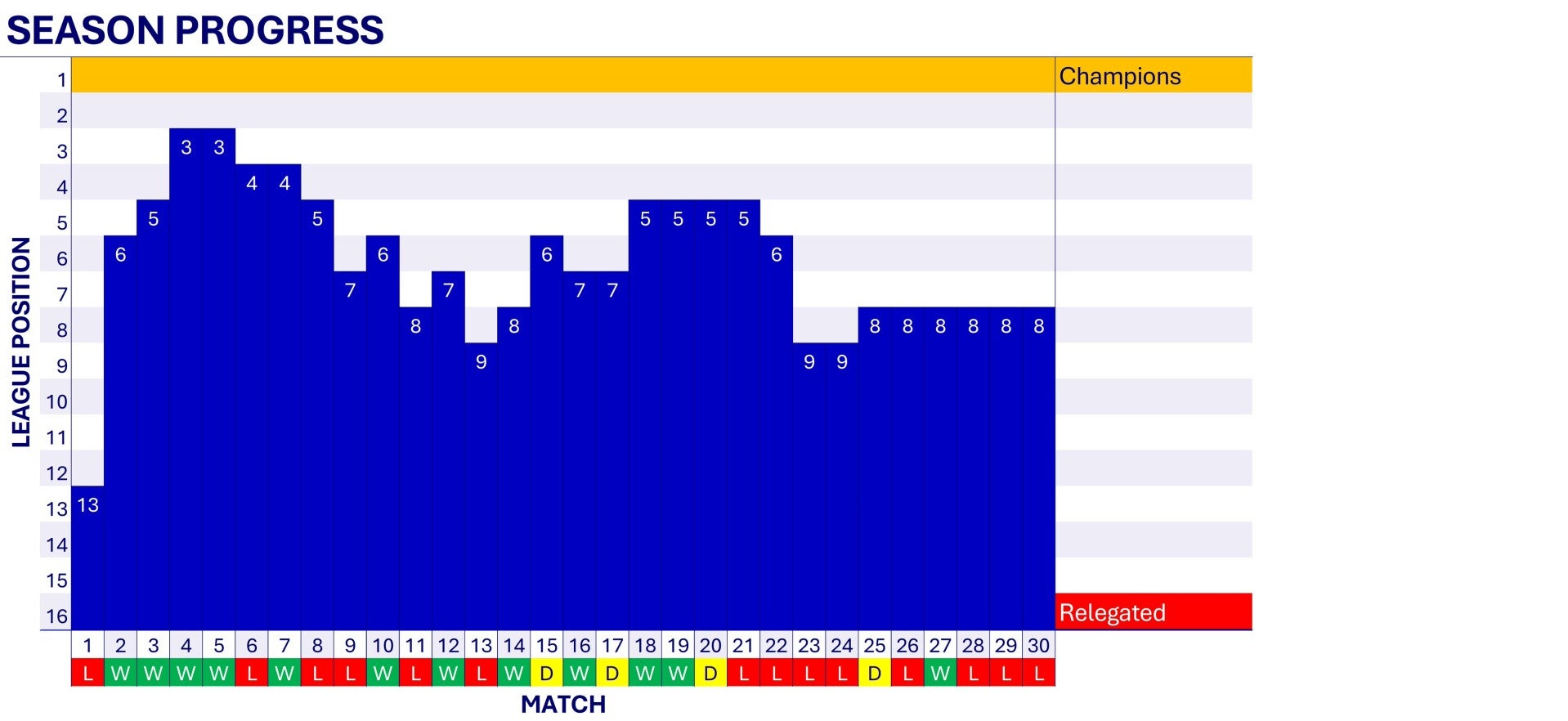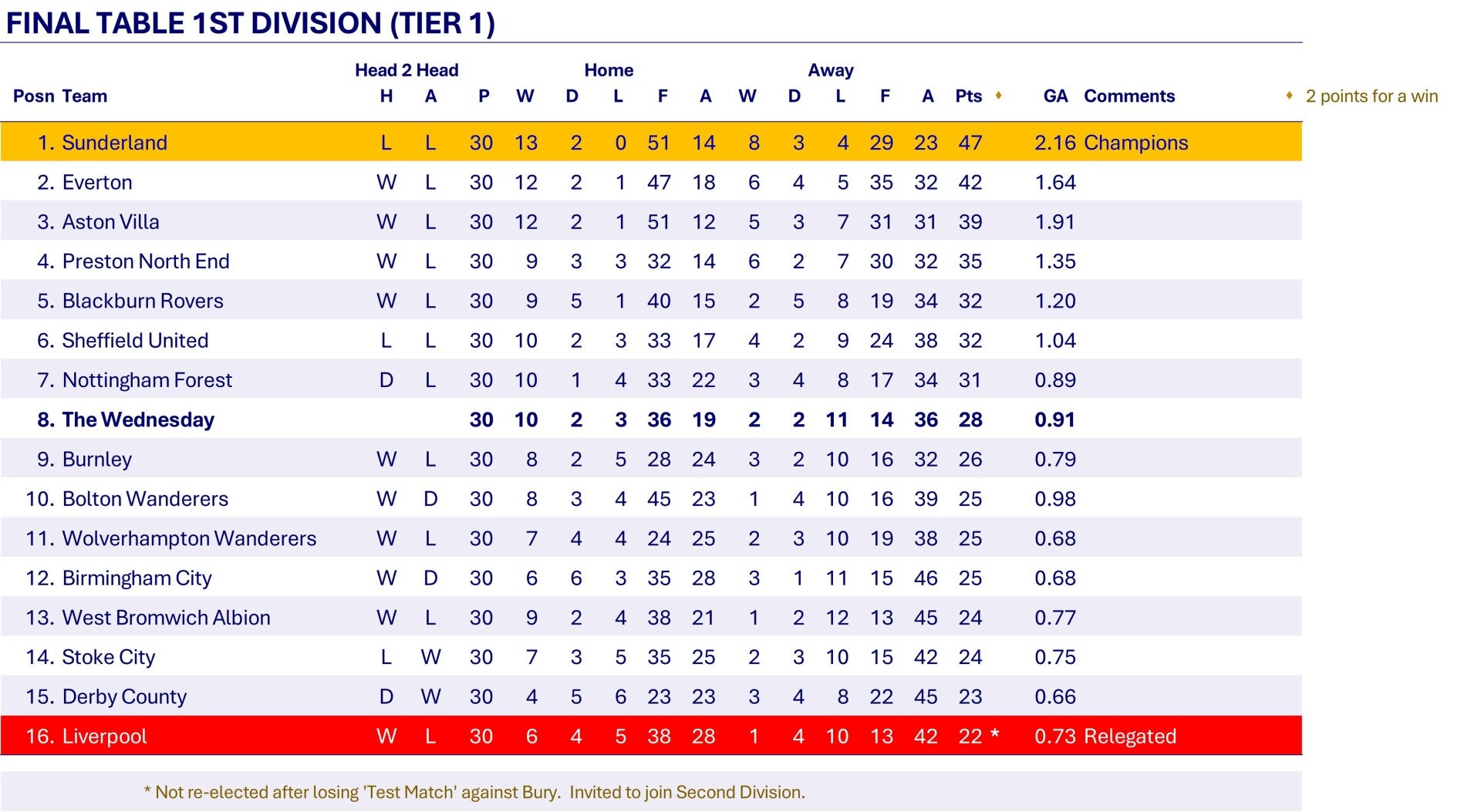 Wednesday have a good 1894 and are in 5th by the New Year. Unfortunately they only win once in the final eleven matches and slump to a mid table finish.