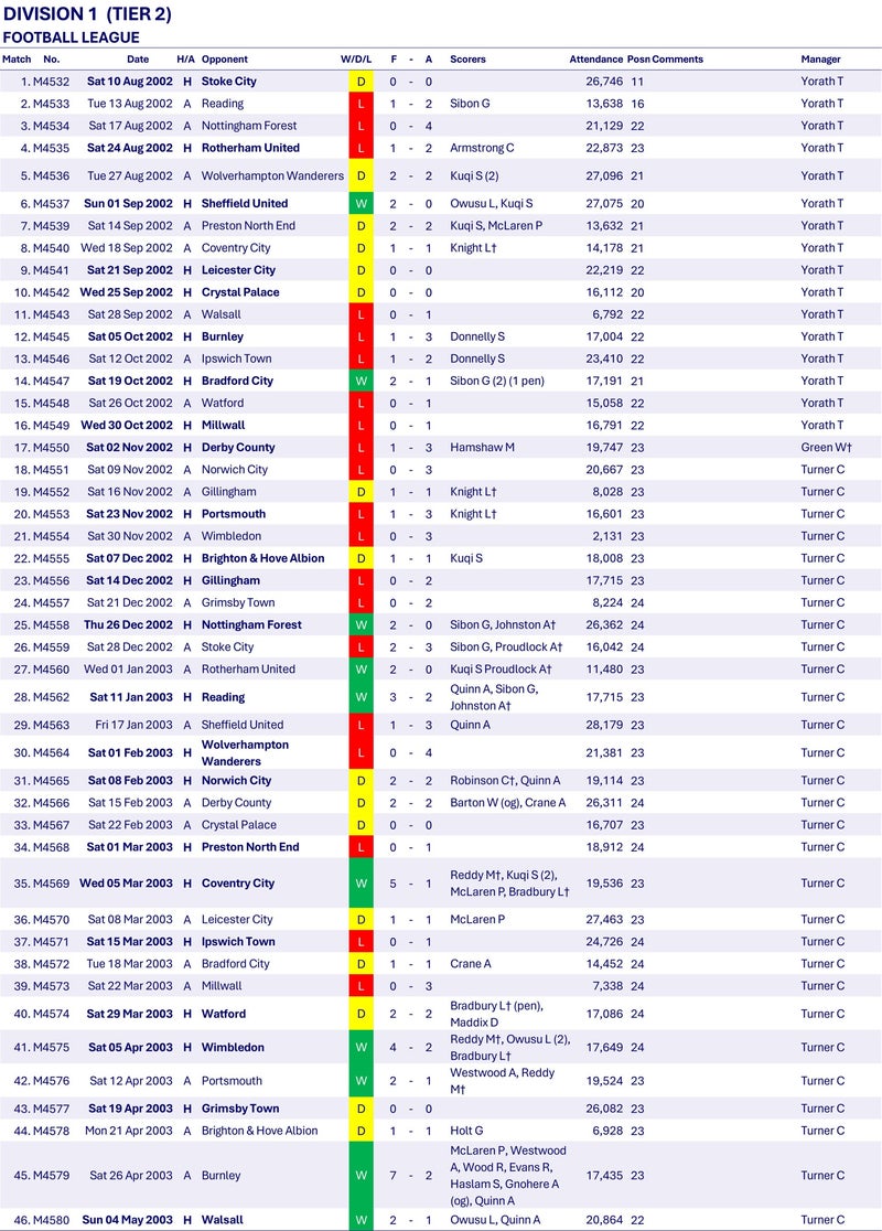 Sheffield Wednesday SWFC The Owls The Wednesday Hillsborough 2002-2003 DIVISION 1 (TIER 2) FOOTBALL LEAGUE Football League FA Cup EFL Cup Pressman K Kuqi S Quinn A McLaren P Bromby L Geary D Sibon G Maddix D Westwood A Soltvedt T Haslam S Armstrong C Barry-Murphy B Monk G† Knight L† Smith D Crane A Burrows D Owusu L Reddy M† Johnston A† Donnelly S Bradbury L† Hendon I Powell D Evans P Beswetherick J Hamshaw M Robinson C† Green R Portsmouth Leicester City Sheffield United Reading Wolverhampton Wanderers Nottingham Forest Ipswich Town Norwich City Millwall Wimbledon Gillingham Preston North End Watford Crystal Palace Rotherham United Burnley Walsall Derby County Bradford City Coventry City Stoke City Sheffield Wednesday Brighton & Hove Albion Grimsby Town Yorath T