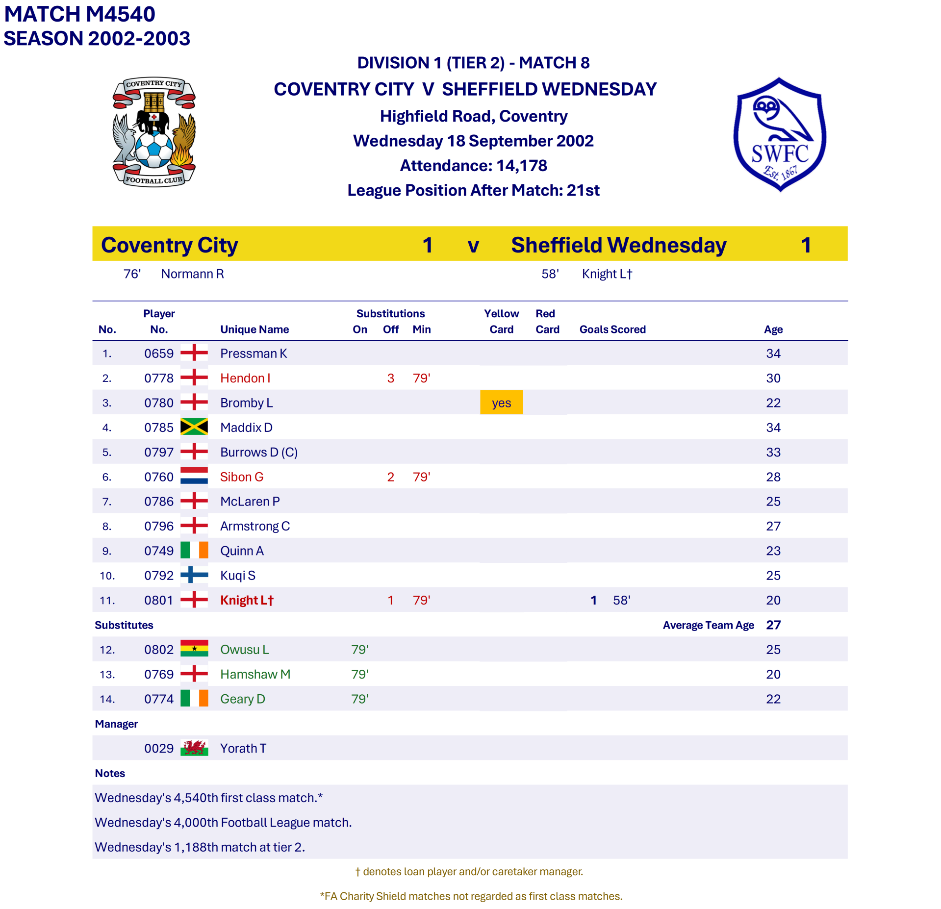 All Wednesday Matches, Players and Managers