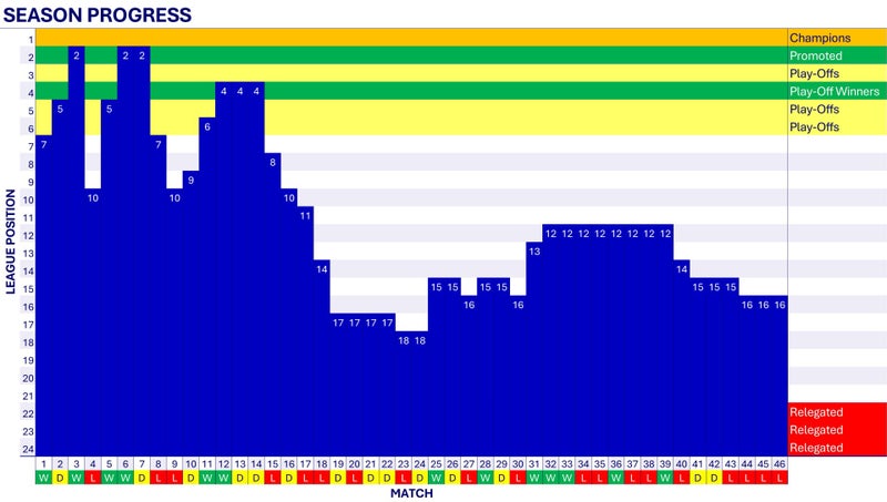 After being relegated the previous season, Wednesday once again struggle. A run of just two wins in eighteen matches sees Wednesday in 18th place in early January. A better run of results follows but one win from the last ten matches sees Wednesday finish in 16th place, five points above the relegation zone.