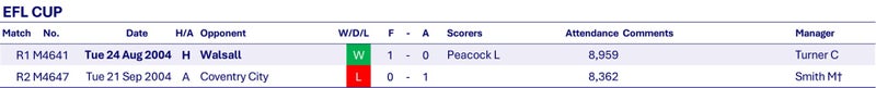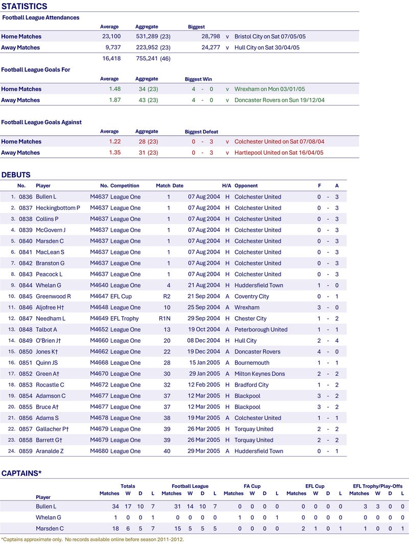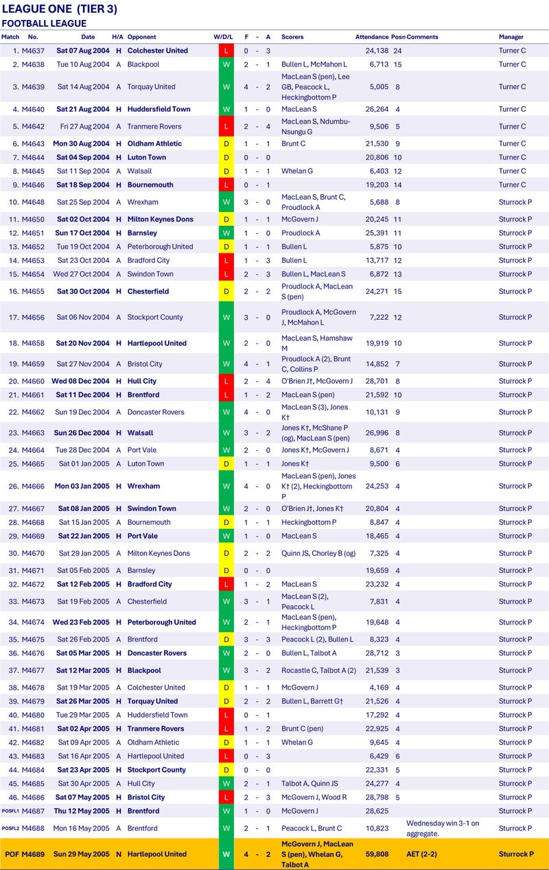 Keywords: Sheffield Wednesday SWFC The Owls The Wednesday Hillsborough 2004-2005 LEAGUE ONE (TIER 3) FOOTBALL LEAGUE Football League FA Cup EFL Cup EFL Trophy McGovern J Bullen L Heckingbottom P Whelan G MacLean S Lucas D Wood R Brunt C Collins P Peacock L Lee GB Marsden C O'Brien J† McMahon L Quinn JS Rocastle C Hamshaw M Proudlock A Branston G Adams S Bruce A† Gallacher P† Smith P Jones K† Barrett G† Ndumbu-Nsungu G Talbot A Tidman O Green A† Aljofree H† Luton Town Hull City Tranmere Rovers Brentford Sheffield Wednesday Hartlepool United Bristol City Bournemouth Huddersfield Town Doncaster Rovers Bradford City Swindon Town Barnsley Walsall Colchester Blackpool Chesterfield Port Vale Oldham Athletic Milton Keynes Dons Torquay United Wrexham Peterborough United Stockport County Turner C