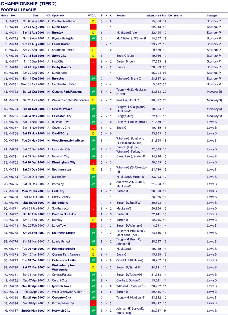 Sheffield Wednesday SWFC The Owls The Wednesday Hillsborough 2006-2007 CHAMPIONSHIP (TIER 2) FOOTBALL LEAGUE Football League FA Cup EFL Cup Brunt C Simek F Tudgay M Burton D Whelan G Bullen L Spurr T Lunt K Bougherra M MacLean S Folly Y Crossley M† Hills J Jones B† Coughlan G Small W O'Brien B Wood R Turner I† Watson S† Andrews W† Johnson JT Gilbert P Sam L† Clarke L Adamson C Talbot A Adams S Beevers M McAllister S Sunderland Birmingham City Derby County West Bromwich Albion Wolverhampton Wanderers Southampton Preston North End Stoke City Sheffield Wednesday Colchester United Plymouth Argyle Crystal Palace Cardiff City Ipswich Town Burnley Norwich City Coventry City Queens Park Rangers Leicester City Barnsley Hull City Southend United Luton Town Leeds United Sturrock P