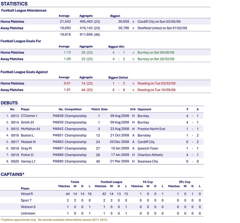 Sheffield Wednesday SWFC The Owls The Wednesday Hillsborough 2008-2009 CHAMPIONSHIP (TIER 2) FOOTBALL LEAGUE Football League FA Cup EFL Cup Grant L Wood R Tudgay M Spurr T McAllister S O'Connor J Beevers M Johnson JT Jeffers F Clarke L Esajas E Potter D† Buxton L Watson S Buxton L† McMahon A† Hinds R Burton D Gray M Gilbert P Small W Ĺšlusarski B† Simek F Gray M† Smith JI† Varney L† Boden L Sodje A Modest N Lekaj R Wolverhampton Wanderers Birmingham City Sheffield United Reading Burnley Preston North End Cardiff City Swansea City Ipswich Town Bristol City Queens Park Rangers Sheffield Wednesday Watford Doncaster Rovers Crystal Palace Blackpool Coventry City Derby County Nottingham Forest Barnsley Plymouth Argyle Norwich City Southampton Charlton Athletic Laws B