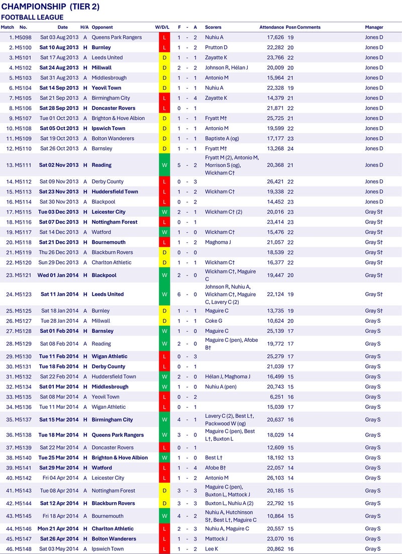 Keywords: Sheffield Wednesday SWFC The Owls The Wednesday Hillsborough 2013-2014 CHAMPIONSHIP (TIER 2) FOOTBALL LEAGUE Football League FA Cup EFL Cup Kirkland C Hélan J Palmer L Lee K Nuhiu A Antonio M Maguire C Loovens G Coke G Mattock J Buxton L Maghoma J Llera M Onyewu O Semedo J Johnson R Johnson Ro† McPhail S Best L† Martínez D† Zayatte K Wickham C† Lavery C Hutchinson S† Prutton D Fryatt M† Johnson JT Olofinjana S Gardner A Afobe B† Leicester City Burnley Derby County Queens Park Rangers Wigan Athletic Brighton and Hove Albion Reading Blackburn Rovers Ipswich Town Bournemouth Nottingham Forest Middlesbrough Watford Bolton Wanderers Leeds United Sheffield Wednesday Huddersfield Town Charlton Athletic Millwall Blackpool Birmingham City Doncaster Rovers Barnsley Yeovil Town Jones D