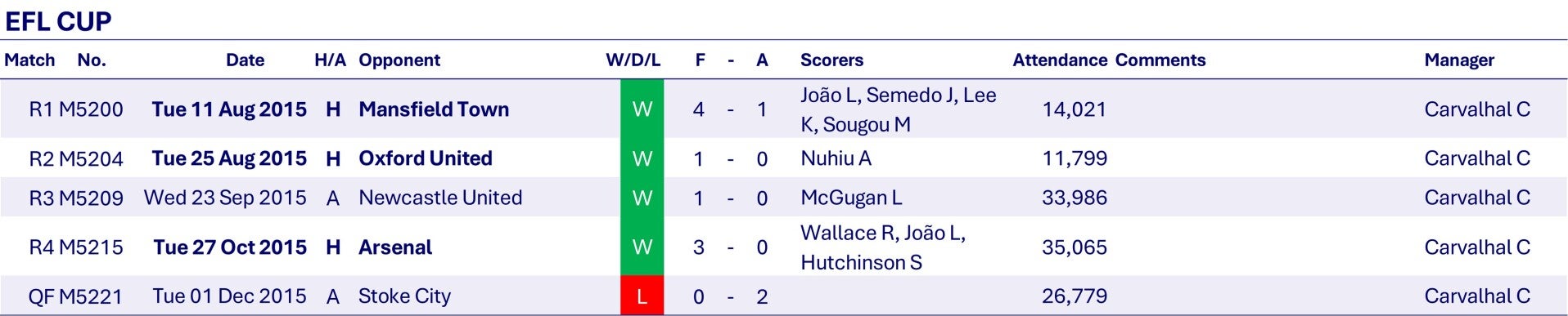 Wednesday reach the quarter-final of the EFL Cup, beating Premier League teams Newcastle United 1-0 away and Arsenal 3-0 at home before losing to Stoke City - another Premier League side, at the Britannia Stadium.