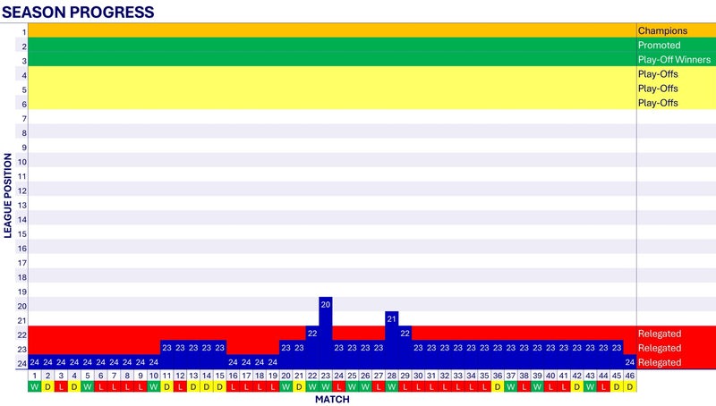 Under Garry Monk Wednesday only win 3 of the first 11 matches and he is sacked with Wednesday 23rd in the league. Tony Pulis takes over the reins and Wednesday go eight matches without a win and only win once during his ten matches in charge. He was sacked two days after his last match - a draw. It was almost certainly this spell that resulted in Wednesday's relegation on the last day of the season. Caretaker Neil Thompson and Darren Moore both fail to halt the rot and Wednesday finish rock bottom and are relegated to League One .