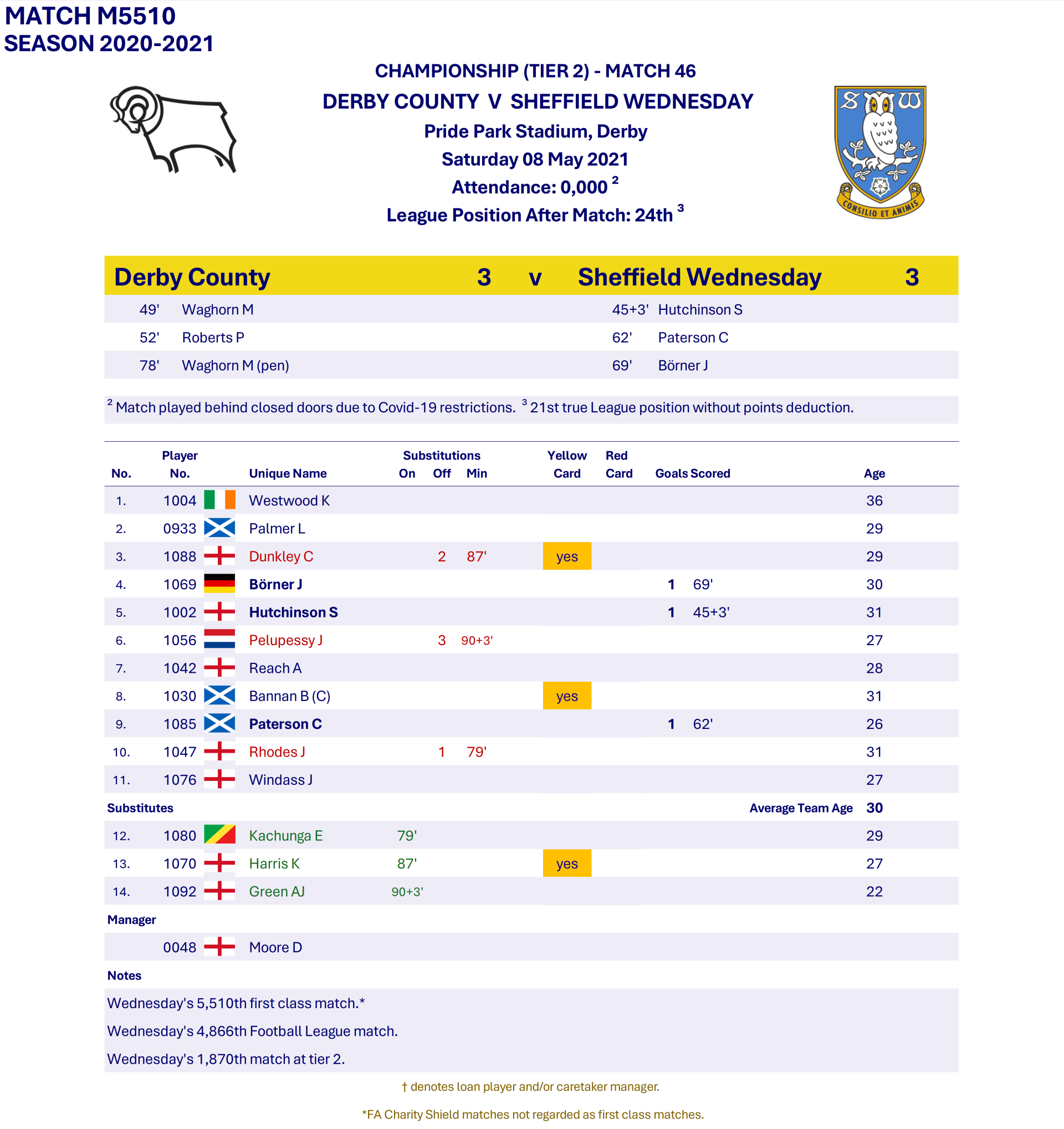 All Wednesday Matches, Players and Managers