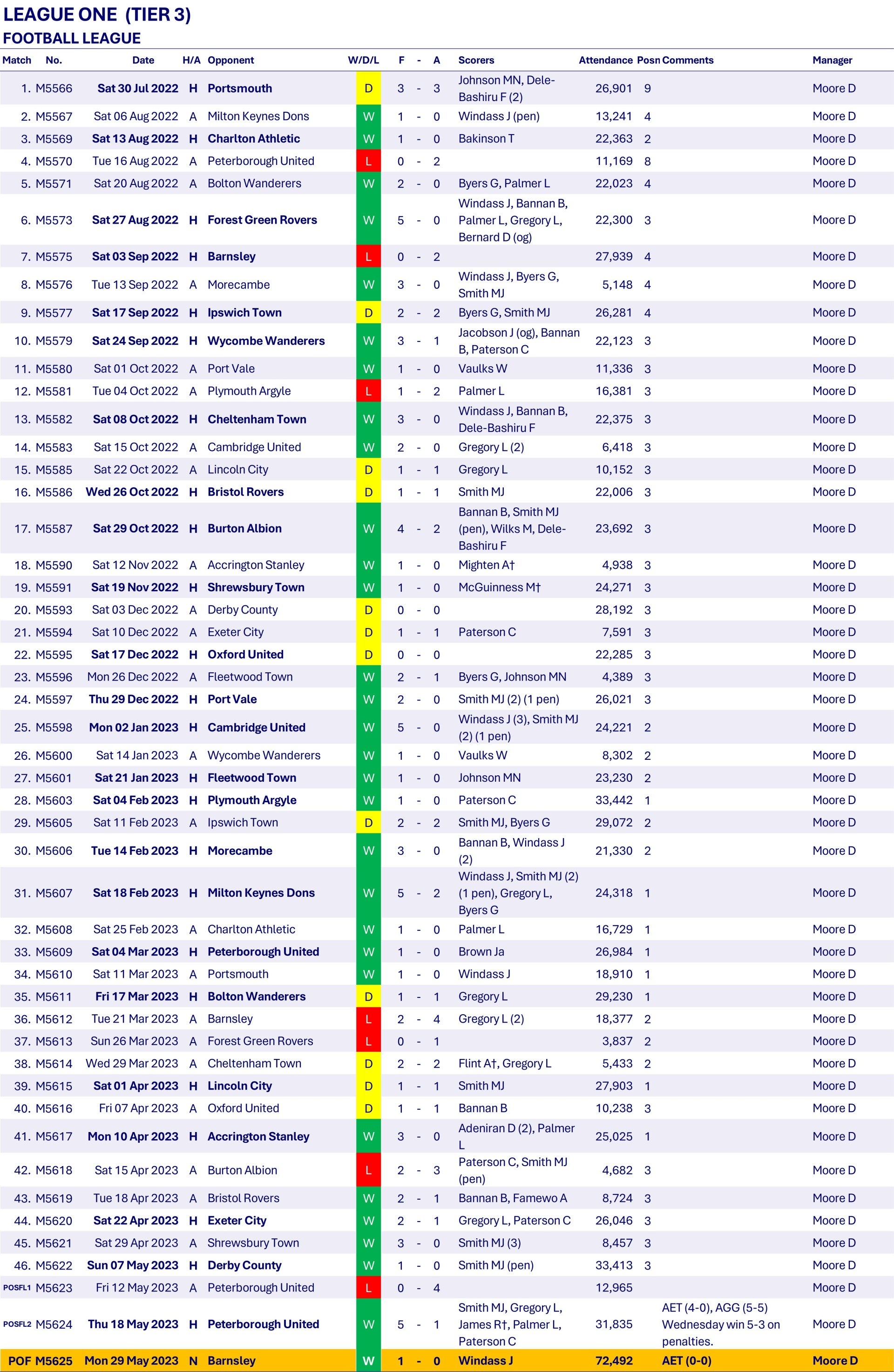 Keywords: Sheffield Wednesday SWFC The Owls The Wednesday Hillsborough 2022-2023 LEAGUE ONE (TIER 3) FOOTBALL LEAGUE Football League FA Cup EFL Cup EFL Trophy Palmer L Bannan B Johnson MN Smith MJ Vaulks W Windass J Iorfa D Gregory L Dawson C James R† Stockdale D Ihiekwe M Byers G Paterson C Flint A† McGuinness M† Famewo A Bakinson T Dele-Bashiru F Heneghan B Adeniran D Hunt J Mighten A† Brown Ja Wilks M Glover J Sow S Shipston R Agbontohoma D Hunt A Plymouth Argyle Ipswich Town Sheffield Wednesday Barnsley Bolton Wanderers Peterborough United Derby County Portsmouth Wycombe Wanderers Charlton Athletic Lincoln City Shrewsbury Town Fleetwood Town Exeter City Burton Albion Cheltenham Town Bristol Rovers Port Vale Oxford United Cambridge United MK Dons Morecambe Accrington Stanley Forest Green Rovers Moore D