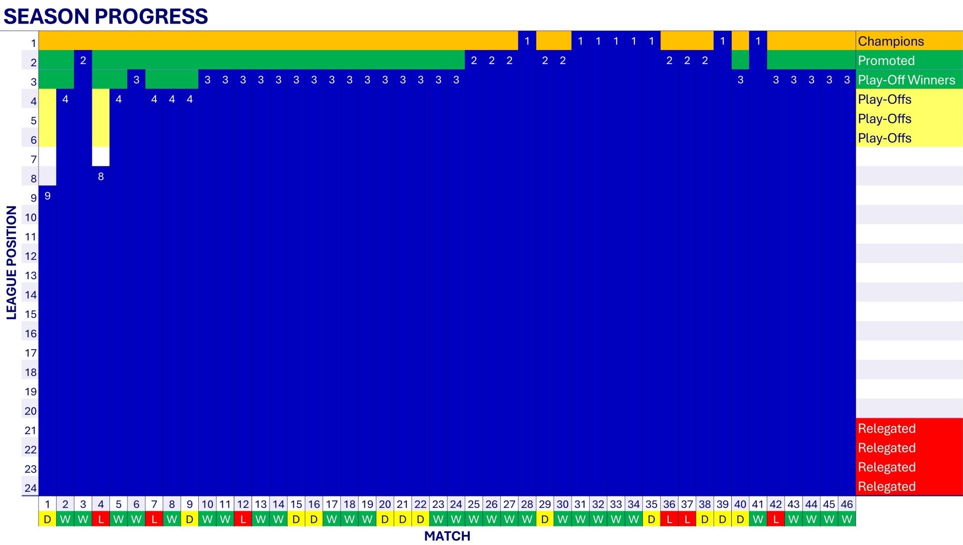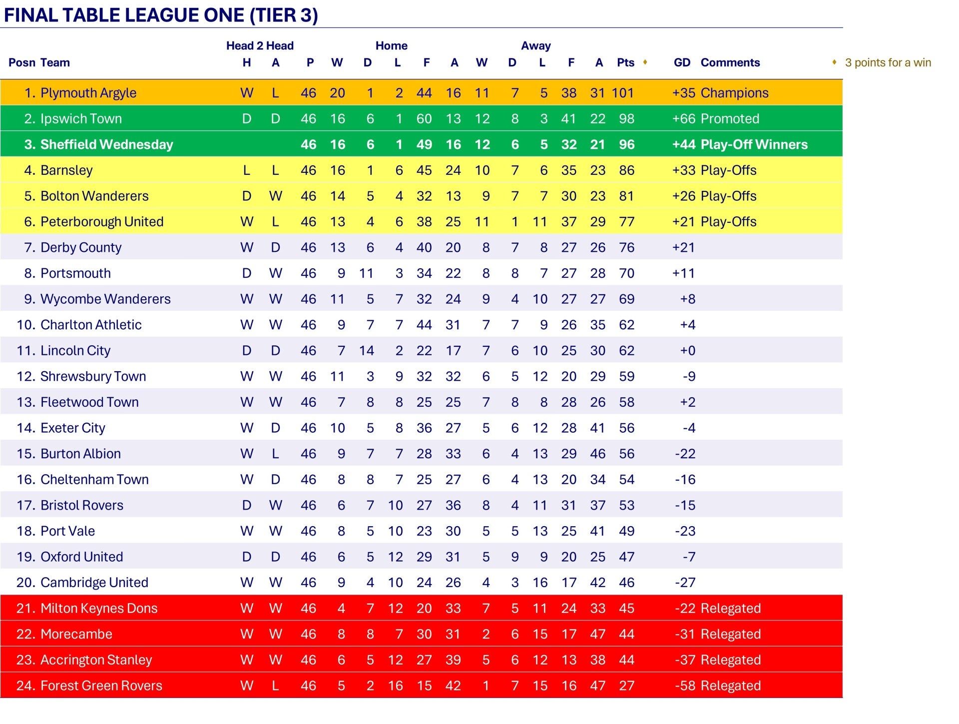 In a record breaking season, Wednesday set a new club points record gaining 96 points, but can only finish 3rd (Wednesday become the first team in EFL history to gain 96 points and not go up automatically). 24 clean sheets in the league is also a new club record, as is 12 away wins in the league.