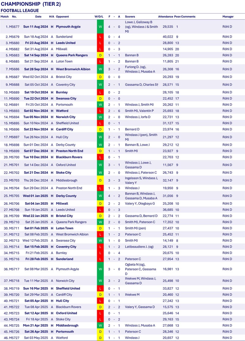 Keywords: Sheffield Wednesday SWFC The Owls The Wednesday Hillsborough 2024-2025 CHAMPIONSHIP (TIER 2) FOOTBALL LEAGUE Football League FA Cup EFL Cup Charles S† Bannan B Windass J Valery Y Beadle J† Gassama D Lowe M Johnson MN Bernard D Ihiekwe M Ingelsson S Smith MJ Iorfa D Ugbo I Paterson C Valentín P Musaba A Lowe J Famewo A Charles P Palmer L Armstrong S Hatsuse R Chalobah N Otegbayo G Kobacki O McNeill C Fusire S Cissoko I† Diaby B Leeds United Burnley Sheffield United Sunderland Coventry City Bristol City Blackburn Rovers Millwall West Bromwich Albion Middlesbrough Swansea City Sheffield Wednesday Norwich City Watford Queens Park Rangers Portsmouth Oxford United Stoke City Derby County Preston North End Hull City Luton Town Plymouth Argyle Cardiff City Röhl D