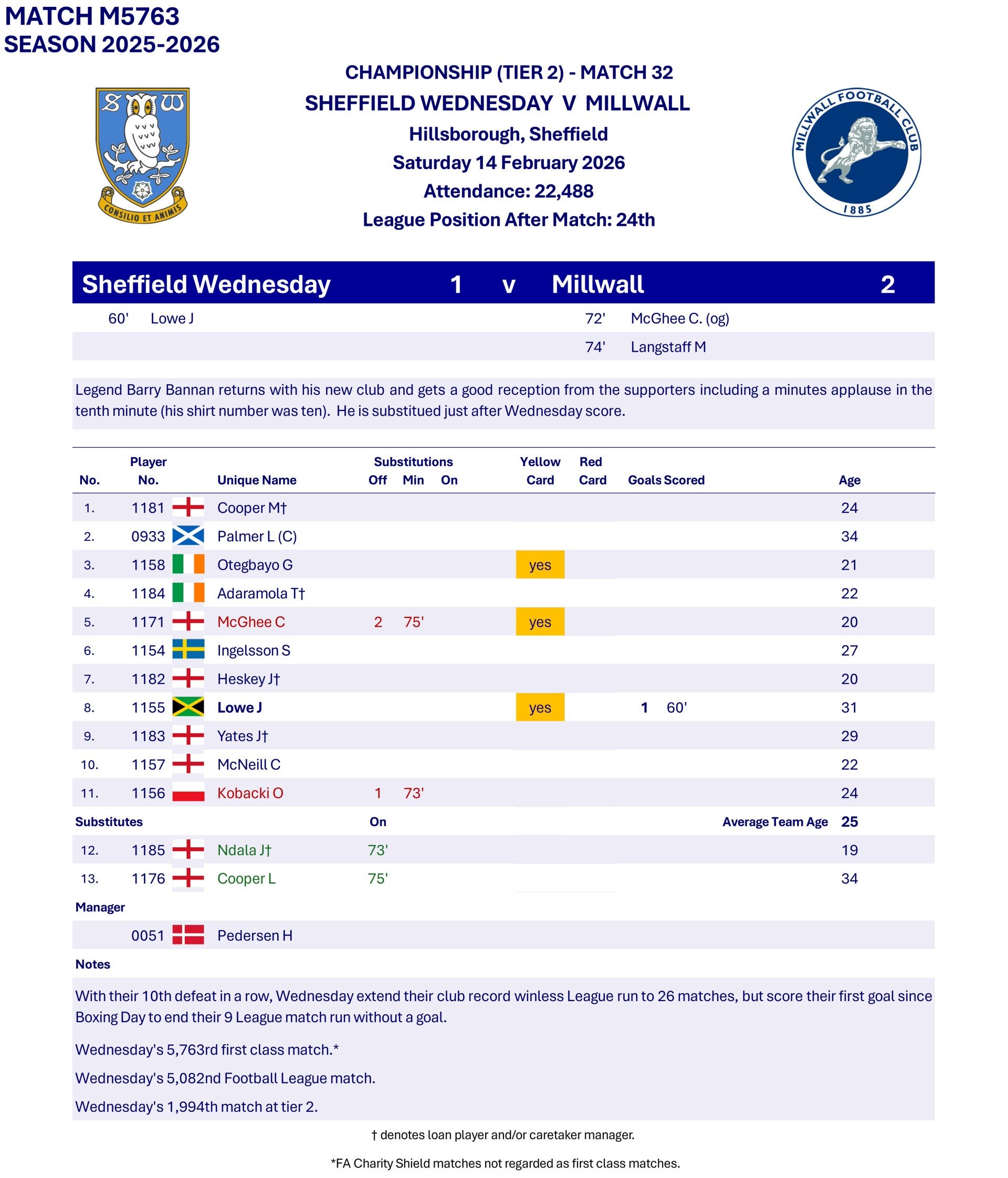 Wednesday finally score after ten matches (nine League) and almost 1000 minutes of football. They avoid setting an all-time Football League record of losing nine matches in a row without scoring. With the defeat Wednesday are on the brink of relegation. If they won every match they would finish on 35 points and Oxford United in 23rd and Leicester City in 22nd both have 32 points, so defeat to neighbours United next Sunday will confirm their relegation with thirteen matches to go.