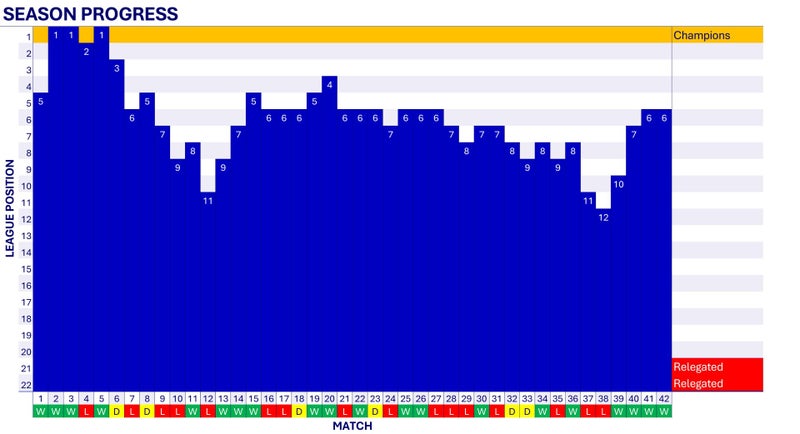 After being runners-up last season under Harry Catterick, new manager Vic Buckingham steers Wednesday to a 6th place finish. Wednesday's season is up and down. They start well and are top in September, only to slump to 11th in mid October. Wednesday rise to 4th in early December, but another slump sees them down to 12th in April. Four wins from the final four matches sees them finish in 6th place.