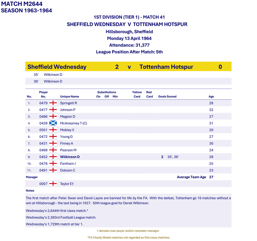 Over 31,000 spectators turn out on a Monday night to pay a poignant tribute to the club in the wake of the match fixing scandal and the lifetime bans handed out to David Layne and Peter Swan by the FA. The Star Green 'Un reports that the "supporters with truly warm and forgiving hearts cheered the 11 men fighting for the honour of the Owls". Spontaneously Wednesday secretary and general manager Eric Taylor makes a dramatic half-time speech to say how grateful the club are to the fans who have stood by Sheffield Wednesday.