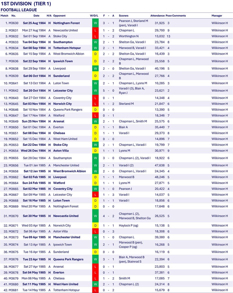 Wednesday's first season back in the top flight is a decent one. Wednesday go on a twelve match unbeaten run between the end of November and the beginning of March and only lose one match in seventeen, leaving them in 5th place. However a blip at the end with four defeats out of five matches sees Wednesday slip to a final position of 8th.