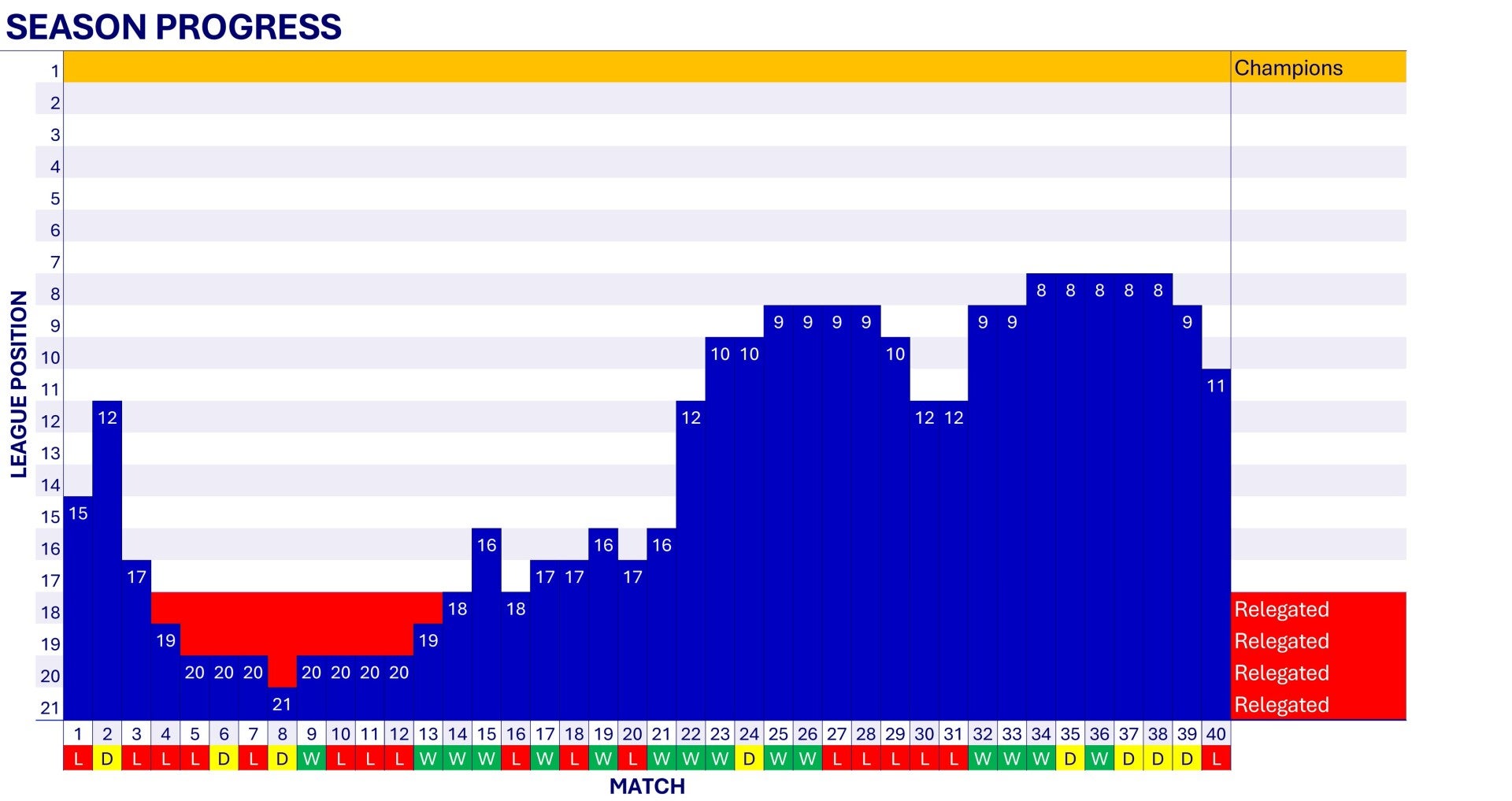 After a poor start to the season which sees Wednesday win just once in the first twelve matches and in the relegation zone, Wednesday lose just three of the next fourteen matches to climb to 9th place by early February. Five consecutive defeats follow, but Wednesday lose just once in the last nine matches to finish the season in mid-table.