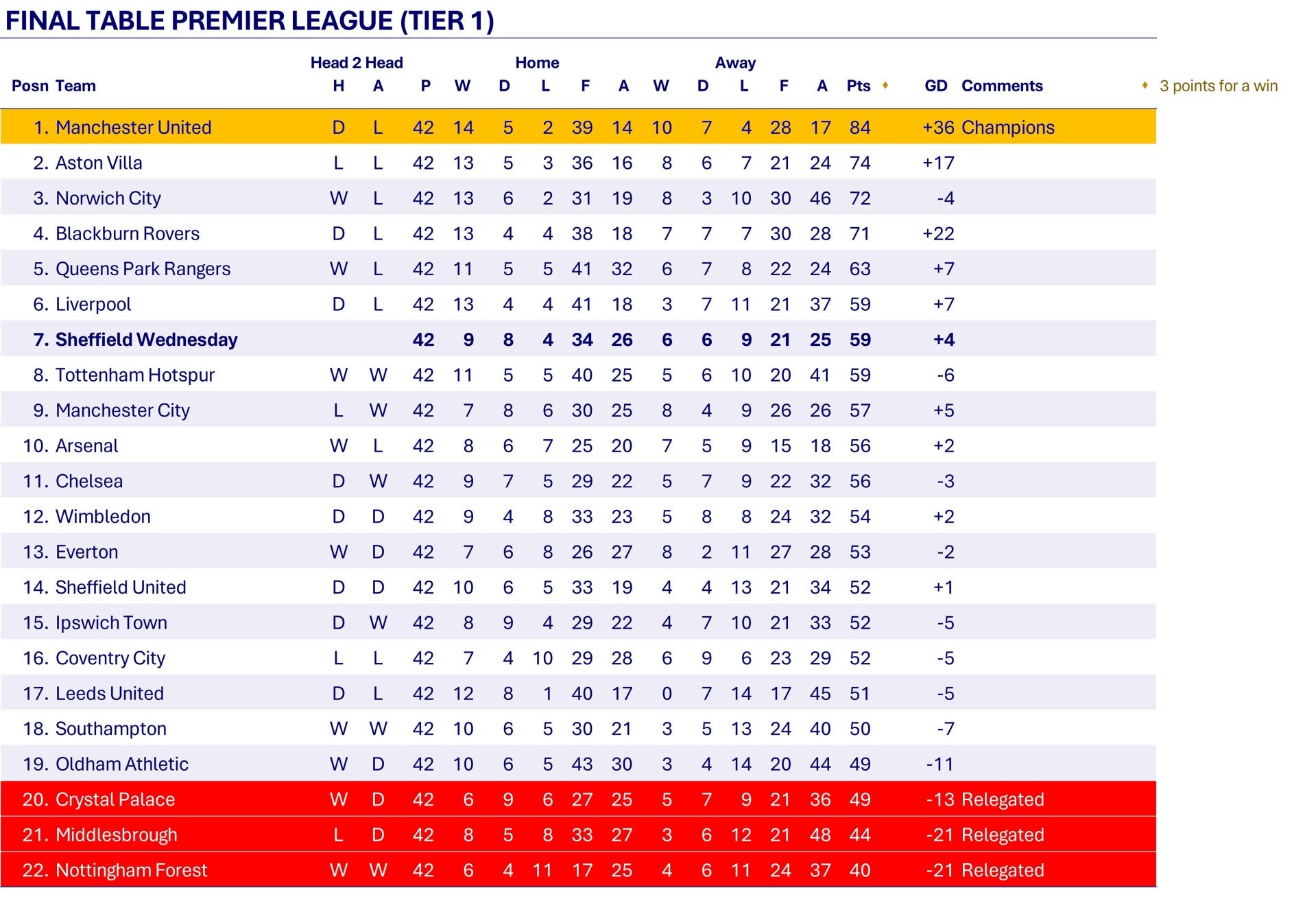 Wednesday are inaugural members of the Premier League and are beaten finalists in both the FA Cup and EFL Cup. Wednesday also take part in the UEFA cup.