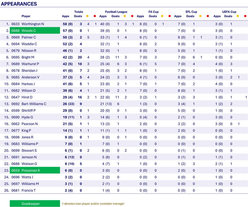 The EFL and FA Cup campaigns were memorable with Wednesday playing at Wembley four times. Wednesday famously meet Sheffield United in the FA Cup semi-final. The match is originally scheduled to be played at Elland Road, Leeds but fan pressure forces the FA to move the tie to Wembley and 75,000 Sheffielders see Wednesday win 2-1. Sadly Wednesday are beaten in the EFL Cup final by Arsenal and in some ways that puts more pressure on the FA Cup where Wednesday once again play Arsenal. The first match end in a 1-1 draw and the replay is once again 1-1 going into extra time. The match looks to be going to penalties until Andrew Linighan scores in the very last minute to break Wednesday fan's hearts.