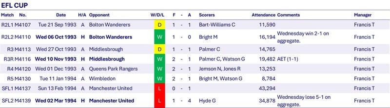 Wednesday reach the semi-final of the EFL Cup but are beaten in both legs by Manchester United.