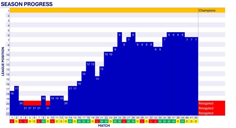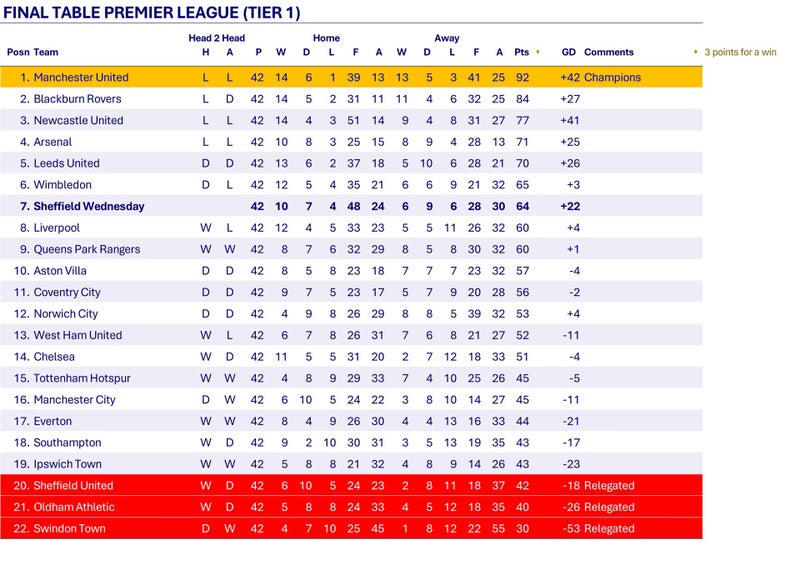 After finishing seventh the previous season, Wednesday make a disappointing start to the season. Just one win in the opening thirteen matches leaves the team in the relegation zone. Four wins in the next five matches eases the position and a strong finish to the season, going nine matches unbeaten, sees Wednesday once again end the season in 7th place.
