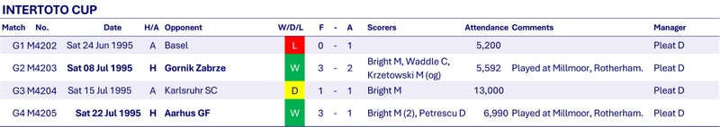 Wednesday play in the Intertoto Cup for the 1st time, but do not progress beyond the group stage. Unfortunately Wednesday don't take the competition seriously and with the players still on holiday, the team for the first match is largely made up of youngsters and loanees. Wednesday lose the tie in Basel and with it the chance to progress beyond the group stage, Karlsruhr winning the group with Wednesday second. Karlsruhr end up contesting the two-leg final and lose on aggregate to Bordeaux. Both of Wednesday's home matches in the competition are played at Millmoor, Rotherham.