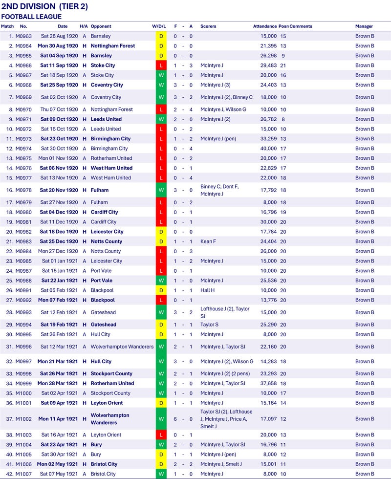 After being relegated and the subsequent resignation of Arthur Dickinson the previous season, Wednesday appoint Bob Brown as their first "proper" manager, with full responsibility for picking the team. After a decent start with two defeats in the first nine matches, Wednesday go on a terrible run of one win in fifteen to leave them in 20th by mid November. However, a terrific run of one defeat in the final fifteen matches sees them finish in a respectable 10th place.