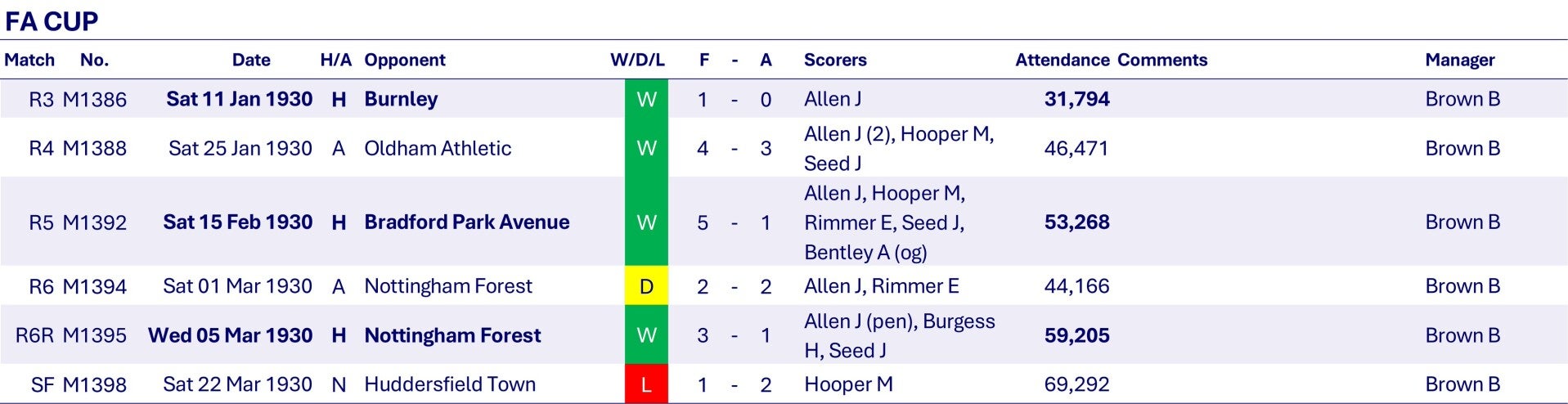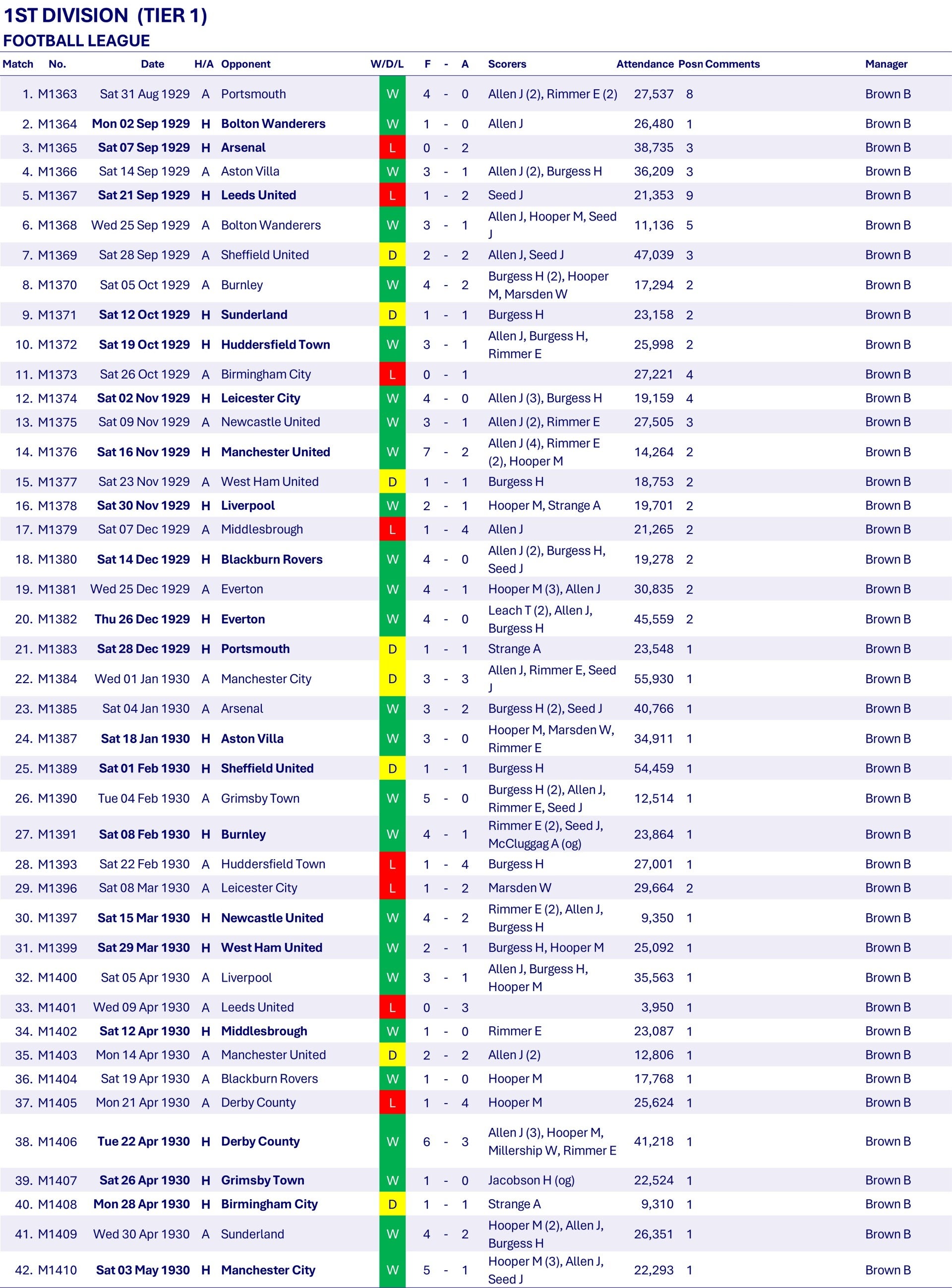 The reigning Champions take a little time to get into their stride, dropping five points in the first four home matches but they remain unbeaten at home the rest of the season and only lose six away matches to finish with sixty points, equalling the record points total set by West Bromwich Albion in 1919-1920 and Liverpool in 1922-1923. Wednesday create a new record of 105 League goals for the season, beating West Browmwich Albion's total of 104 also set in 1919-1920.