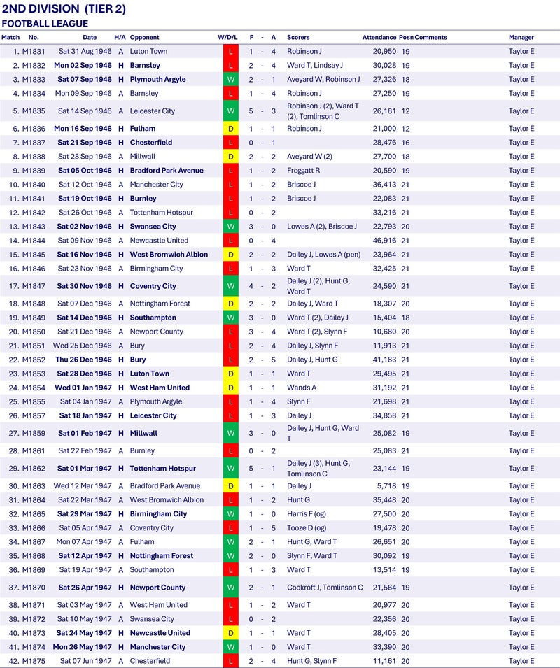 In the first season after WW2, Wednesday really struggle, giving debuts to an astonishing nineteen players. They are in 21st place for a number of weeks, but thankfully do just enough to avoid the unthinkable relegation to the 3rd Division for the first time in their history, finishing in 20th place, three points above Swansea Town (now City). Notably the season runs into June as the "Big Freeze" of 1947 disrupts matches between January and March.