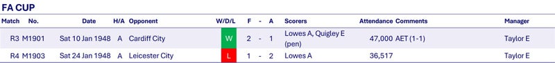 In the FA Cup Wednesday beat Cardiff City at Ninian Park in the 3rd round before losing to Leicester City at Filbert Street in the 4th round.