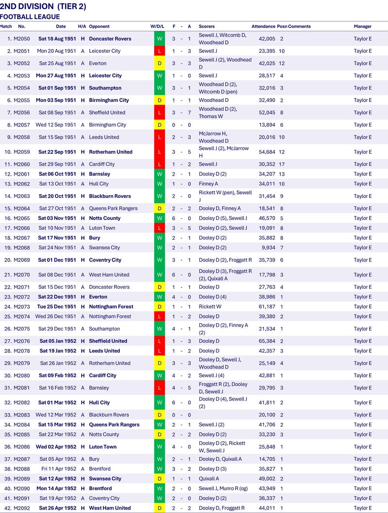 After a disappointingly inconsistent start to the season, including losing 7-3 at Bramall Lane and 5-3 at home to Rotherham United, Wednesday are in 17th place by the end of September. On the 6th October Wednesday beat Barnsley, Derek Dooley getting his first start of the season and scoring both goals. Dooley is the catalyst as Wednesday go on a run of only one defeat in thirteen matches, which sees them in the top three. A final run of eleven matches without defeat including seven wins propels Wednesday to the Championship, beating Cardiff City by two points. Wednesday score exactly 100 goals with Derek Dooley scoring a remarkable 46 League goals in just 30 appearances.
