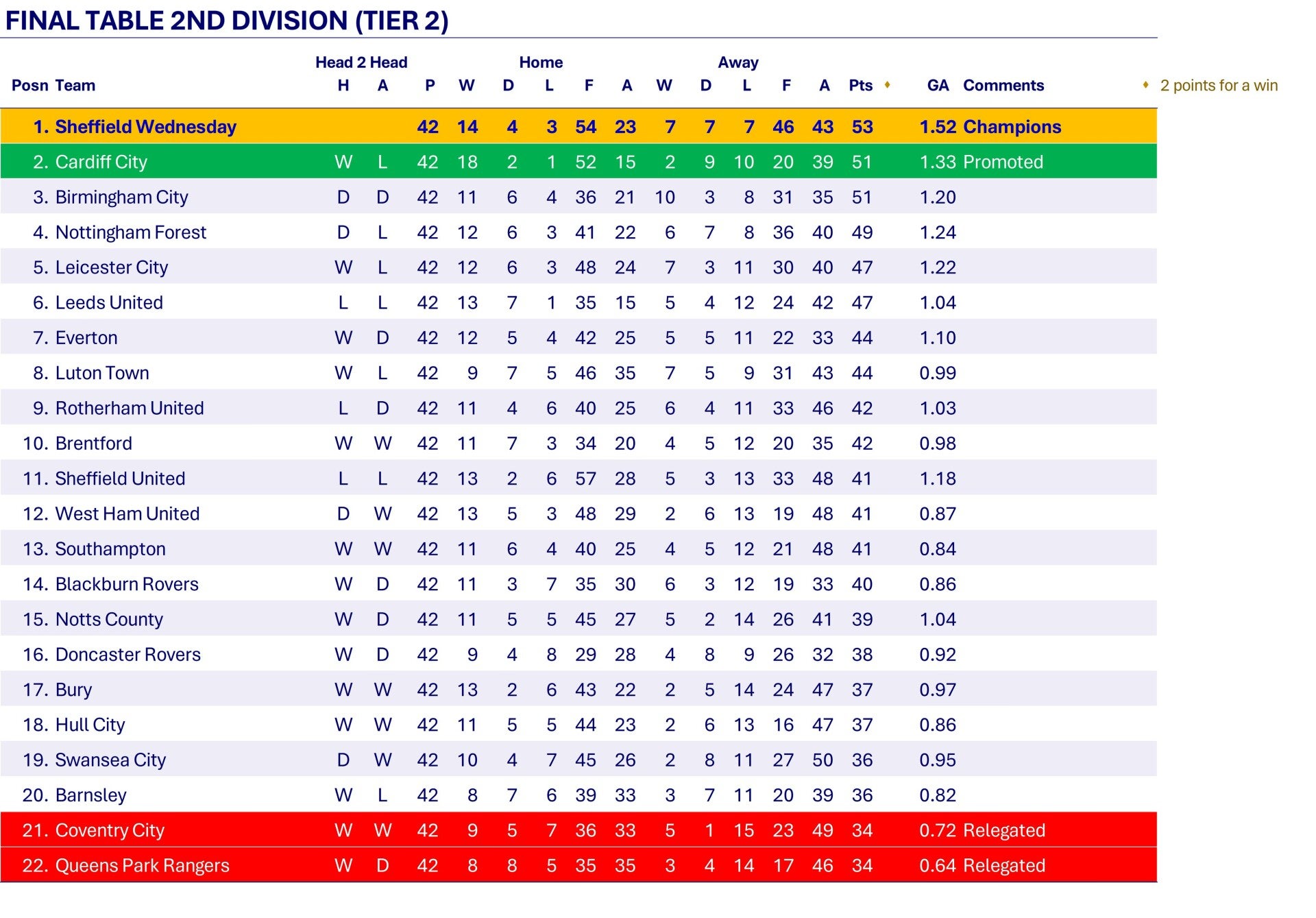 Wednesday are 2nd Division (Tier 2) Champions for the 3rd time in their history and are promoted to the 1st Division (Tier 1).