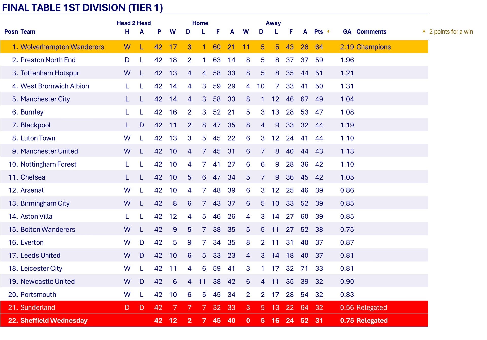 In a hugely disappointing season Wednesday fail to win an away League match all season and are relegated to the 2nd Division. Despite winning two of the last three matches, Wednesday finish bottom, just a point behind the 19th and 20th placed teams, Newcastle United and Portsmouth who stay up. After the season the Wednesday board decide to advertise for a new manager and Eric Taylor becomes club secretary.