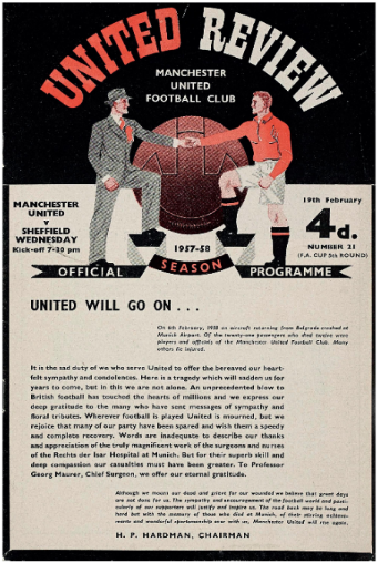 The FA Cup tie is United's first fixture since the Munich air disaster. A makeshift United team containing two survivors, seven reserves and two newly-signed players are carried to victory on a wave of emotion from the nearly 60,000 crowd. United go on to play in the FA Cup final but are beaten 2-1 by Bolton Wanderers - on the day I was born!