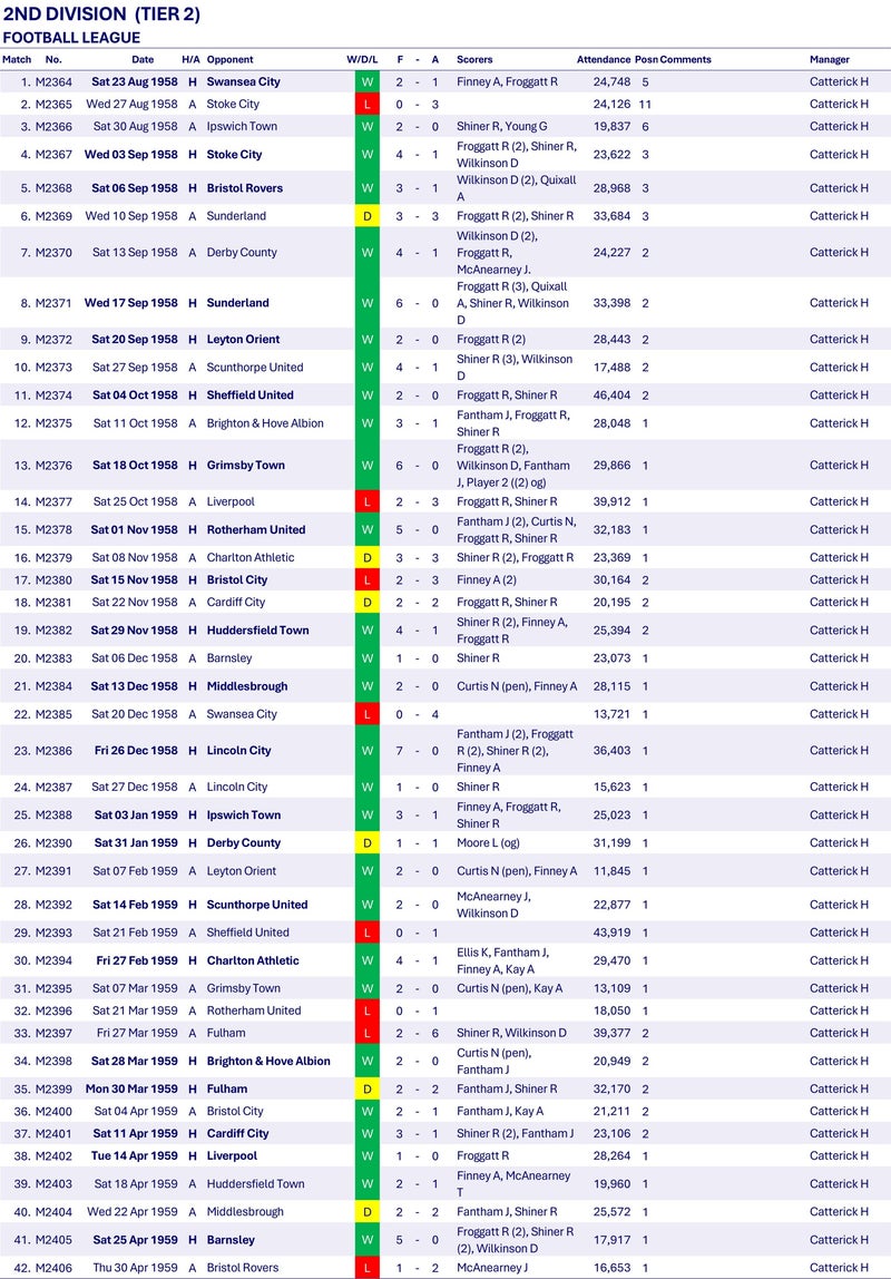 For the 3rd time in eight seasons after getting relegated to the 2nd Division the previous season, Wednesday immediately bounce back and are promoted as Champions in Harry Catterick's first season as manager. Wednesday go on a run of seven straight wins in September and October scoring twenty-seven goals in the process. Wednesday also beat Lincoln City 7-0 to equal their record win in the 2nd tier. Wednesday score 106 goals in their 42 matches, Roy Shiner being the top scorer with 28 goals.