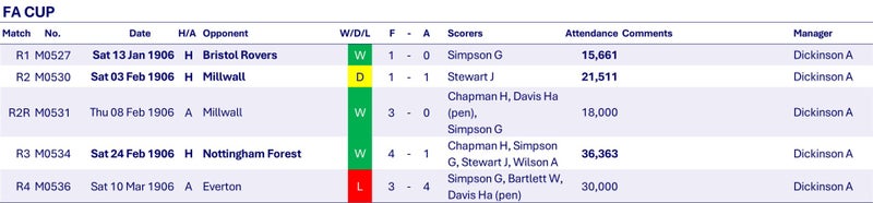 In the FA Cup, Wednesday beat Western League teams Bristol Rovers and Millwall in the 1st and 2nd rounds in Wednesday's first meeting between both clubs. Wednesday beat Nottingham Forest in the 3rd round before losing to Everton at Goodison Park in the 4th round.
