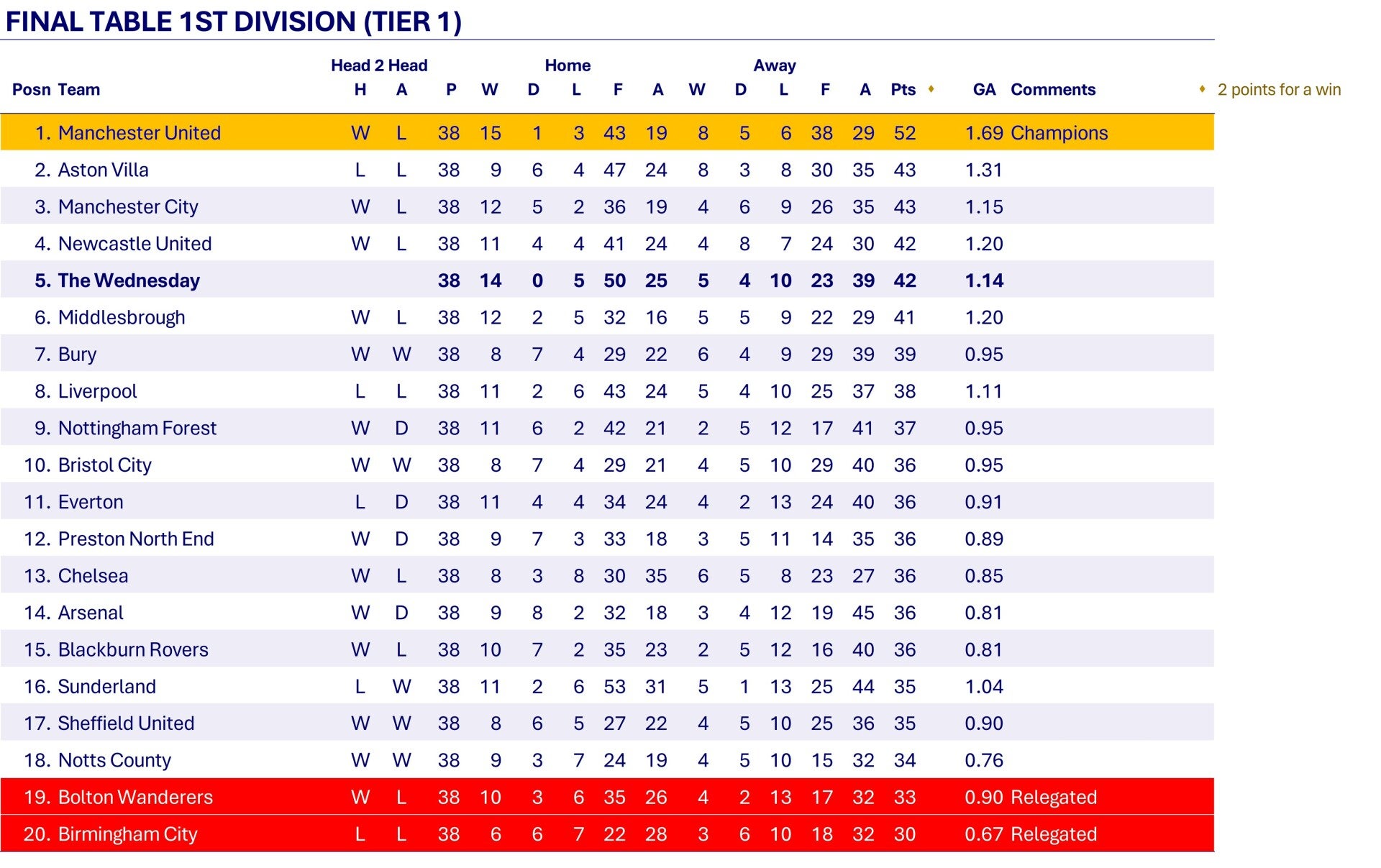 A good season sees Wednesday in the top three most of the season and a 2-0 win against The Blades in early March sees them go 2nd. However Wednesday only win three of the remaining eleven matches and slip to a disappointing 5th place finish, ten points behind Manchester United who are 1st Division Champions for the first time.