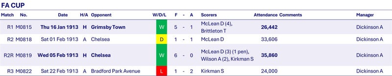 In the FA Cup, Wednesday beat 2nd Division Grimsby Town in the 1st round and Chelsea after a replay in the 2nd round before losing to 2nd Division Bradford at Park Avenue in the 3rd round.