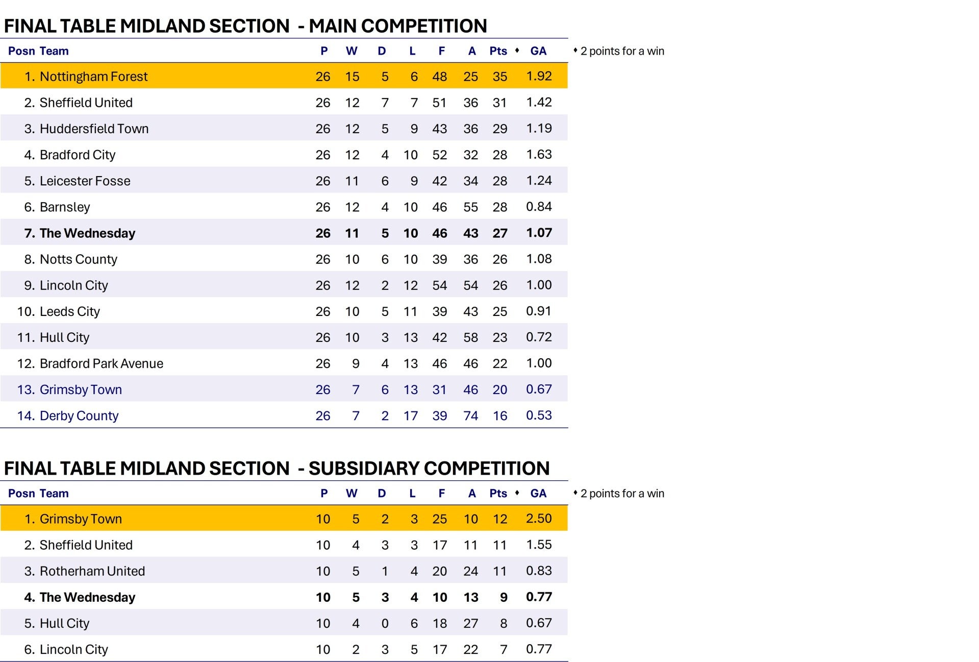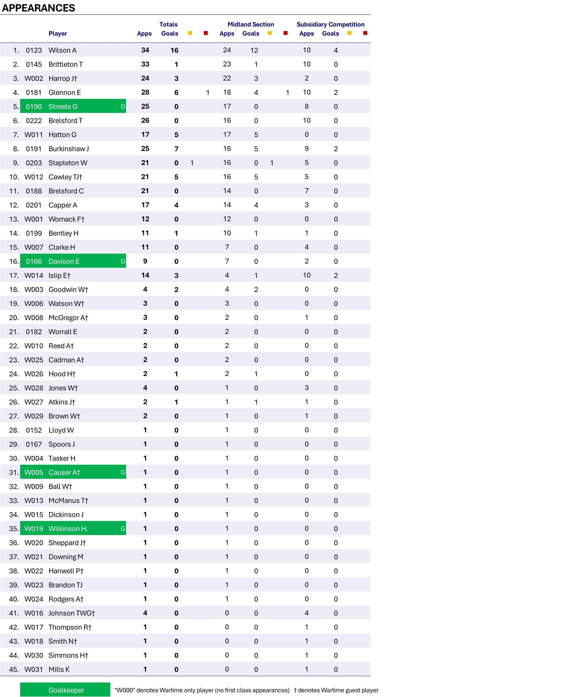 A series of regional leagues were formed, with Wednesday being in the Midland Section. There was also a smaller subsidiary competition formed. Wednesday get off to a terrible start in the Midland Section, losing the first five matches. Their season thereafter is good but unfortunately they have a match postponed and one abandoned. With no midweek matches being possible Wednesday have to fit these matches in over Easter. They play the postponed match with Lincoln on good Friday, which isn't a Bank Holiday for the munitions industry (in which most of the players are employed) and have to play a scratch team made up of players brought in from local football. They also play on Easter Saturday, Bank Holiday Monday and play the abandoned match with Barnsley on Tuesday, so four matches in five days! Of course they struggle losing four out of five and it hits their final league position in both competitions.
